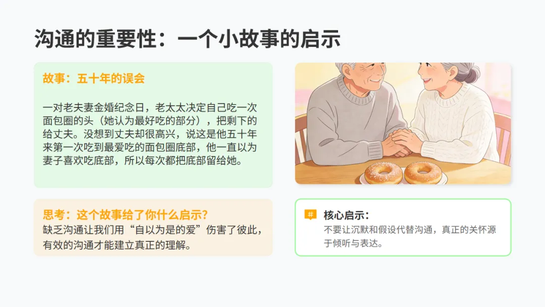 一对老夫妻,在她们结婚五十年后,准备举行金婚纪念。就在这天吃早饭的时候,老太太想:“五十年来,每天我都为丈夫着想,早餐吃面包圈时,我都把最好吃的面包圈的头让给他吃。今天,我该自己好好享受这个美味了。于是,她切下了带奶油的面包圈的头给自己,把剩下的给丈夫。不料,她丈夫很高兴,吻了吻她的手,说:“亲爱的,你今天给了我最大的享受。五十年来,我从没有吃过面包圈的底部,那是我最爱吃的,我一直想你也一定喜欢吃那个。”