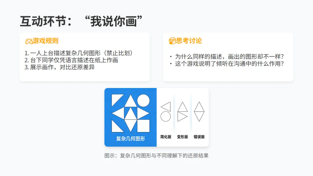 1.角色扮演 情境创设:请一位学生讲讲在班上哪位同学最受欢迎,他哪些方面值得自己学习?学生在讲话时,老师东张西望,似乎在寻找什么物品,或打断对方说话,或是到学生中间处理问题,学生讲完了,老师追着问:“你刚才讲什么? 问题讨论:刚才我扮演的这个角色是不是一个合格听众?为什么不是一个合格听众?有哪些地方做得不对? 分析引导:请这位学生谈谈自己的感受。引导学生分析不合格听众的表现。如:不看对方、不感兴趣、做其他事情、不断插嘴、不耐烦等。指出在倾听时,除了耳朵之外,还要学会用眼睛、表情、动作、语言告诉对方你在真诚、认真地倾听。