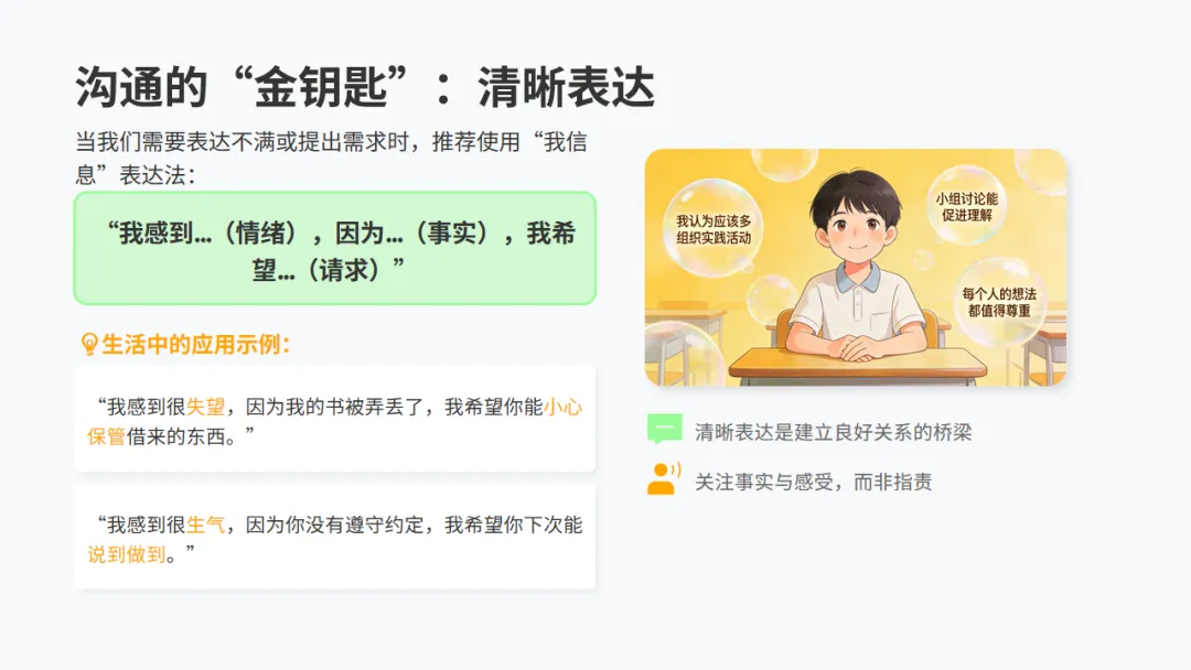 5.教师引导:“人际交往中可以通过哪些方式来主动表达对别人的喜欢和肯定?”