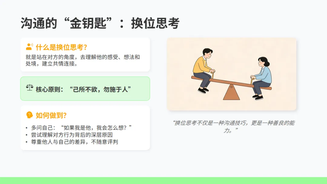 ②小结: 每个人的心都像上了锁的大门,任你再粗的铁杆也撬不开。唯有关怀,才能把自己变成一把细腻的钥匙,进入别人的心中,了解别人。所以沟通时,一定要为别人着想,以心换心,以情动人。
