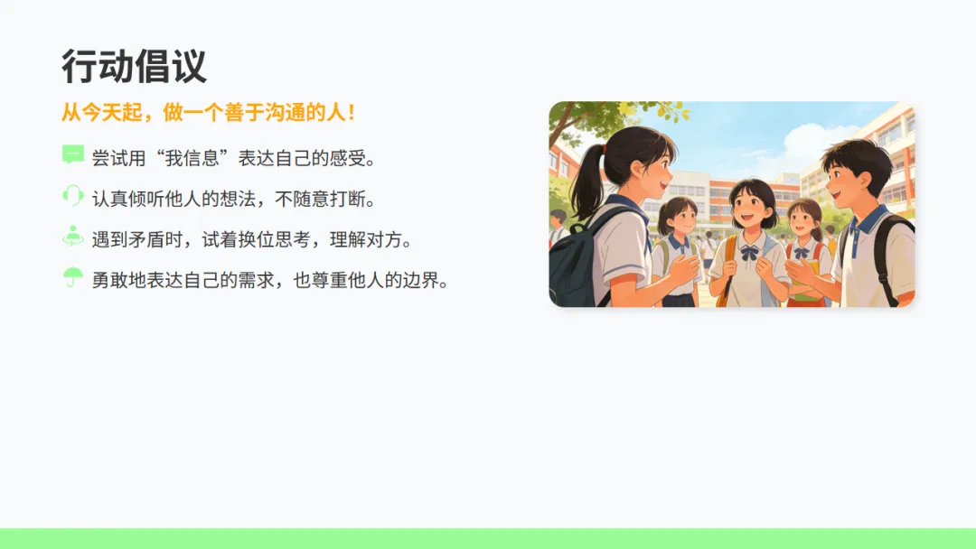 四、总结提升,拓展练习 通过同学们参与体验和讨论交流,我们了解掌握了一些人际沟通的方法和技巧,下面请大家在熟悉的歌声中,运用本节课学到的这几个十分有效的人际沟通方法与技巧,用表示友好的各种动作、语言(如握手、微笑、问好、招手、鼓掌、拥抱、点头、拉手、击掌等)来表达我们同学主动交往的心愿,体验与人交往带来的快乐,相信这一路走来,欢笑伴随你,友情伴随你。