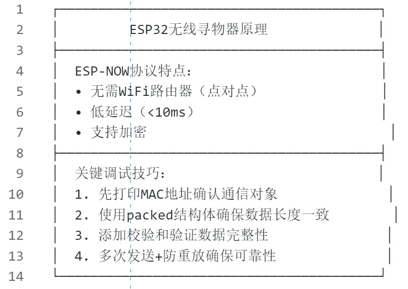 /** * 无线寻物器 - 接收端 (Receiver) * 功能:接收ESP-NOW信号,触发声光报警 * 硬件:ESP32 + 有源蜂鸣器 + WS2812环形灯 */#include <WiFi.h>#include <esp_now.h>#include <Adafruit_NeoPixel.h>// ========== 引脚定义 ==========const int BUZZER_PIN = 25; // 有源蜂鸣器(高电平触发)const int LED_RING_PIN = 26; // WS2812数据引脚const int LED_COUNT = 12; // 灯环LED数量// 初始化灯环对象Adafruit_NeoPixel ring(LED_COUNT, LED_RING_PIN, NEO_GRB + NEO_KHZ800);void setup() { Serial.begin(115200); Serial.println("\n=== 无线寻物器 - 接收端启动 ==="); pinMode(BUZZER_PIN, OUTPUT); digitalWrite(BUZZER_PIN, LOW); ring.begin(); ring.setBrightness(255); setRingColor(0, 0, 0); // 初始关闭 // TODO: 初始化ESP-NOW}void loop() { // TODO: 处理报警逻辑}void setRingColor(uint8_t r, uint8_t g, uint8_t b) { for (int i = 0; i < LED_COUNT; i++) { ring.setPixelColor(i, ring.Color(r, g, b)); } ring.show();}边写边讲:"这是通信的'合同',必须与发射端一字不差!"