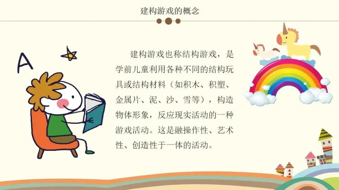 首先,我们来明确什么是建构游戏。建构游戏也称结构游戏,是学前儿童利用各种不同的结构玩具或结构材料,比如积木、积塑、金属片,还有泥、沙、雪这类自然材料,甚至是易拉罐、薯片桶这些废旧材料,去构造物体形象、反映现实活动的一种游戏活动。它最大的特点就是融操作性、艺术性、创造性于一体,幼儿在动手操作的过程中,既锻炼了动手能力,也能发挥想象力和创造力,同时还能在造型搭建中获得艺术感知。