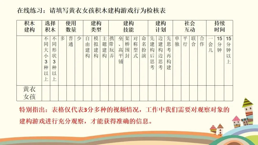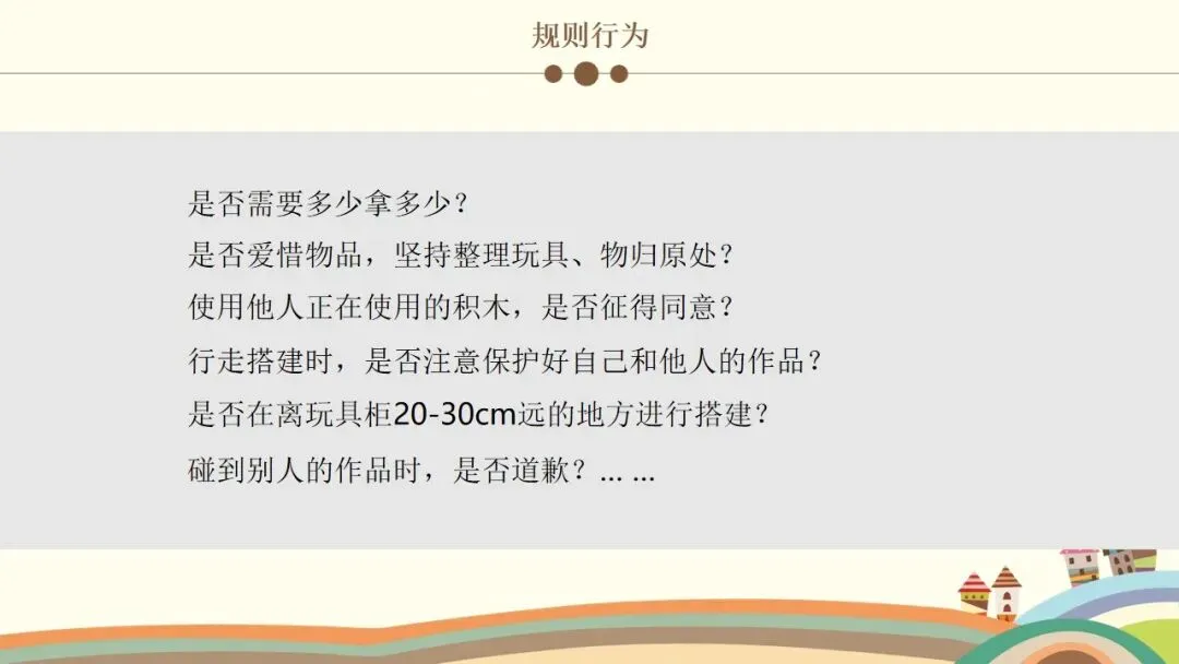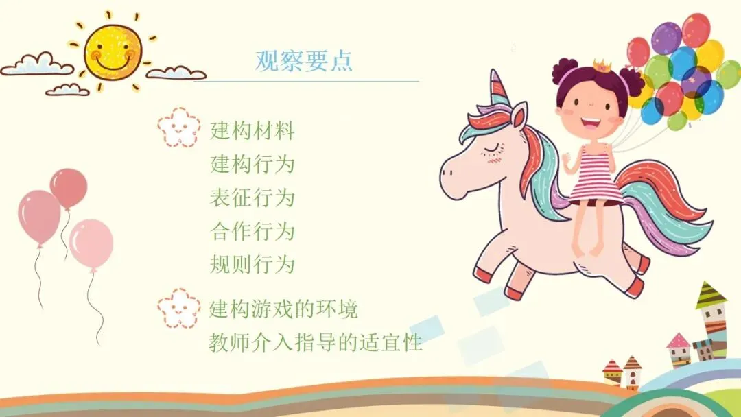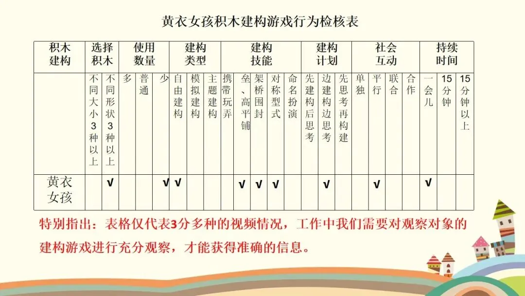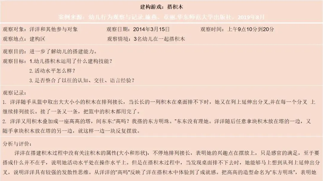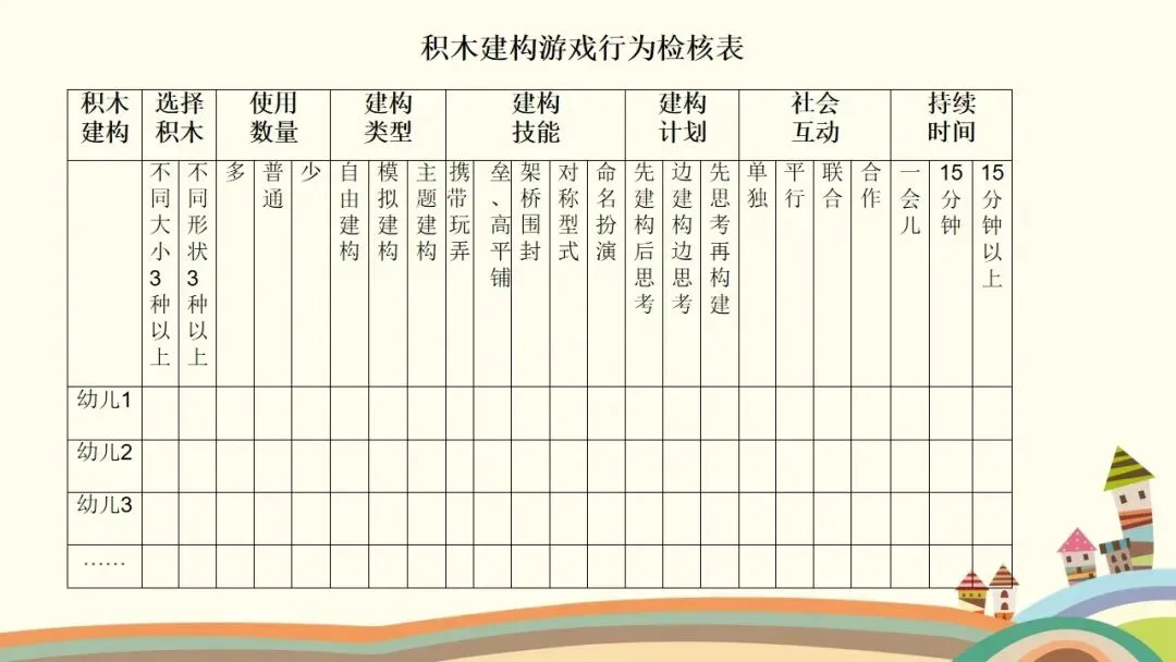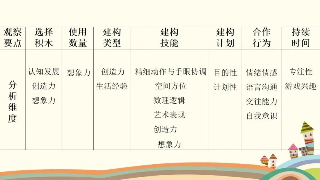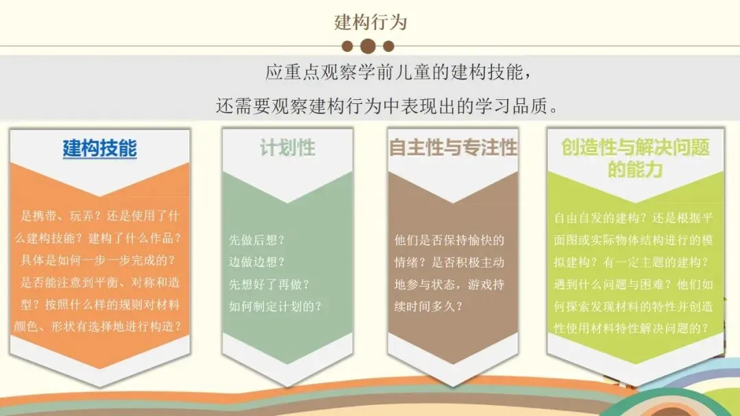第二个是建构行为,这是观察的核心之一。首先看幼儿的情绪和参与状态,他们是否保持愉快的情绪,是否积极主动参与,游戏持续了多久;接着看幼儿对材料的使用方式,是单纯携带、玩弄,还是运用了特定的建构技能,建构了什么作品,具体是一步一步如何完成的;还要观察幼儿是否能注意到搭建的平衡、对称和造型,是否会按照一定规则对材料的颜色、形状进行选择性构造。同时,幼儿的思维方式也值得关注,是先做后想、边做边想,还是先想好了再做,又是如何制定搭建计划的。另外,建构的类型也需要区分,是自由自发的建构,还是根据平面图或实际物体结构的模拟建构,亦或是有一定主题的建构;幼儿在搭建中遇到了什么问题与困难,又是如何探索发现材料特性,并创造性地利用材料特性解决问题的。这里要特别强调,我们不仅要重点观察学前儿童的建构技能,还需要观察建构行为中表现出的学习品质。大家也要记住积木游戏的发展水平阶段,从低到高依次是非建构活动、垒高平铺重复、架桥围封、模式,最后是表征,这能帮助我们判断幼儿的建构发展阶段。