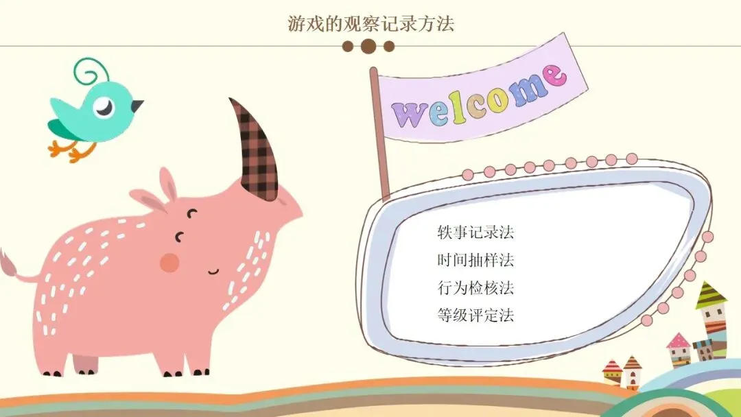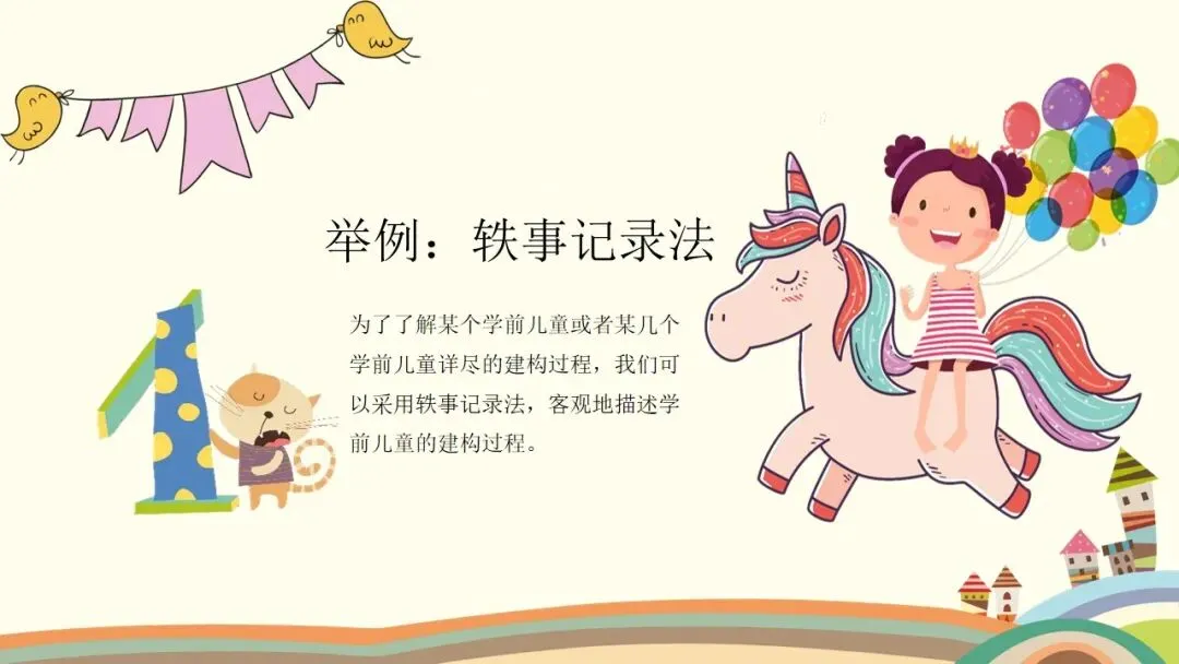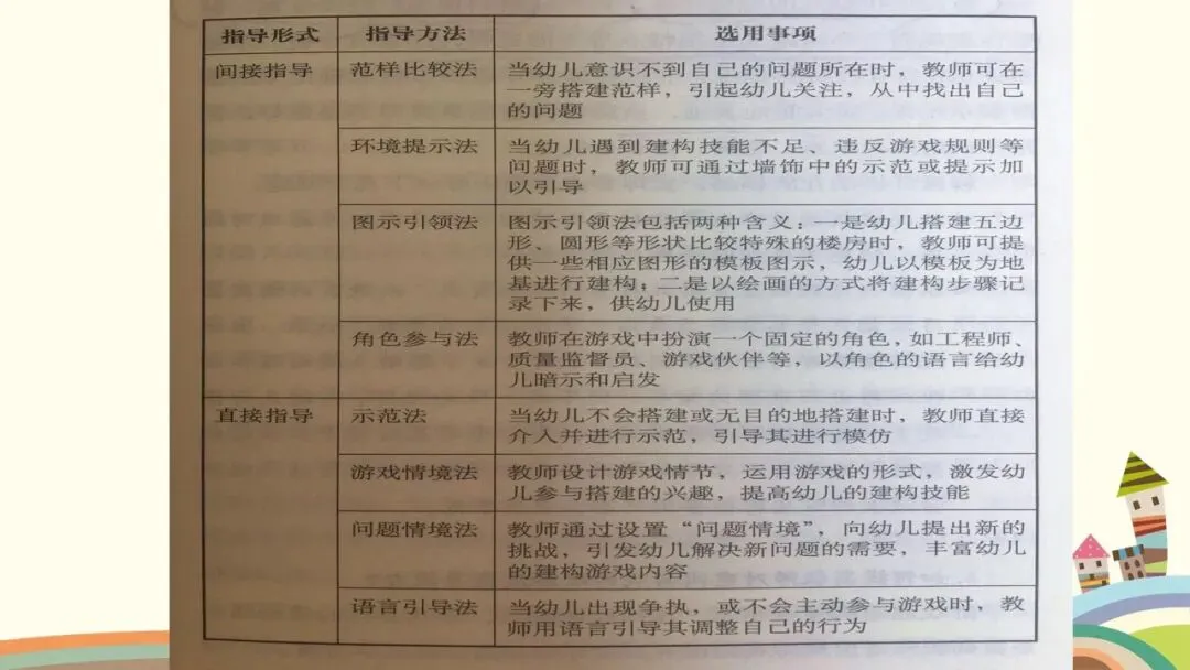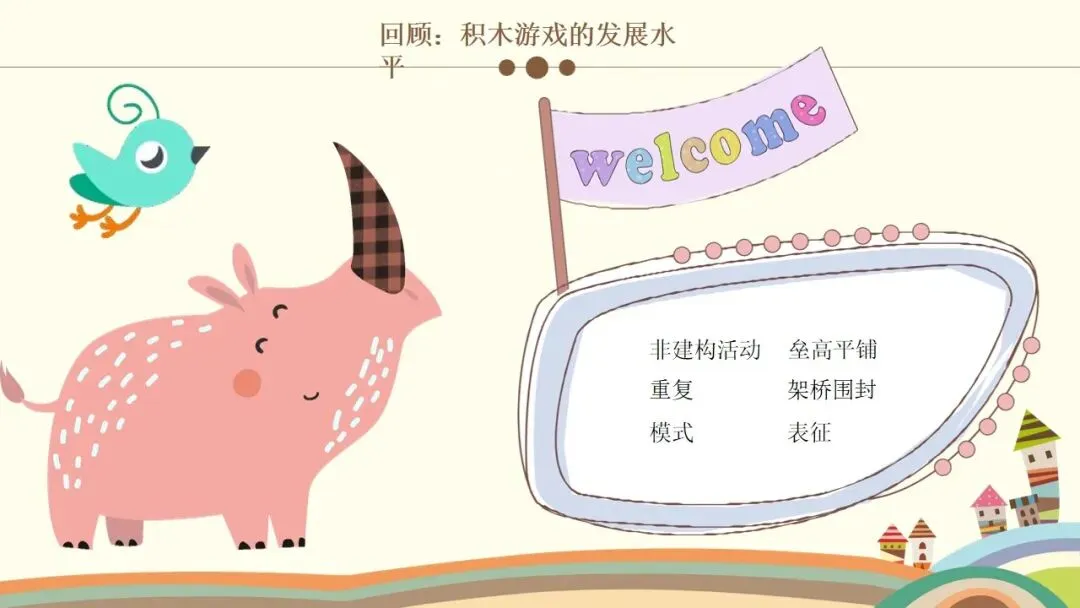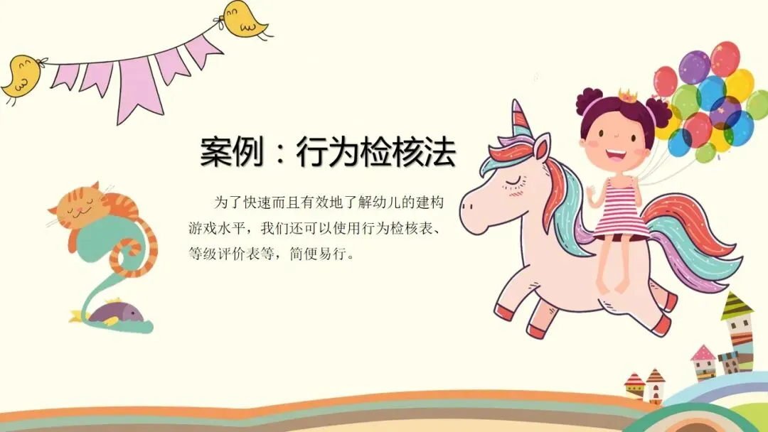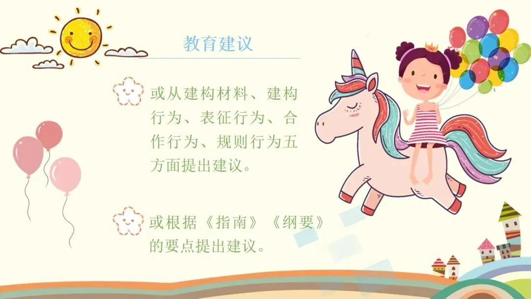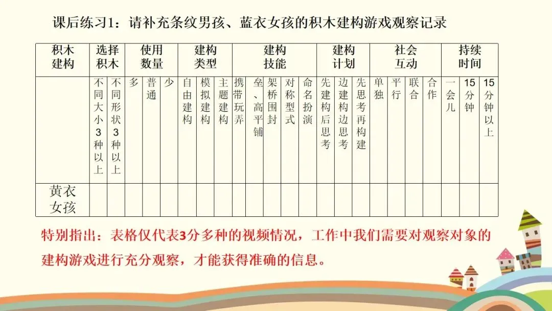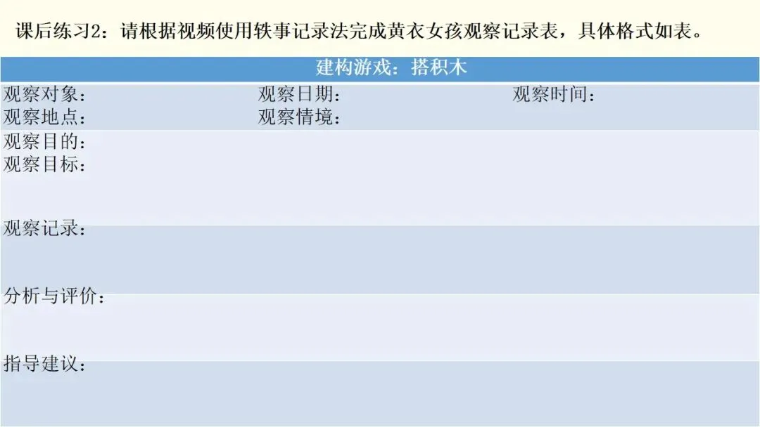 第二个是建构行为,这是观察的核心之一。首先看幼儿的情绪和参与状态,他们是否保持愉快的情绪,是否积极主动参与,游戏持续了多久;接着看幼儿对材料的使用方式,是单纯携带、玩弄,还是运用了特定的建构技能,建构了什么作品,具体是一步一步如何完成的;还要观察幼儿是否能注意到搭建的平衡、对称和造型,是否会按照一定规则对材料的颜色、形状进行选择性构造。同时,幼儿的思维方式也值得关注,是先做后想、边做边想,还是先想好了再做,又是如何制定搭建计划的。另外,建构的类型也需要区分,是自由自发的建构,还是根据平面图或实际物体结构的模拟建构,亦或是有一定主题的建构;幼儿在搭建中遇到了什么问题与困难,又是如何探索发现材料特性,并创造性地利用材料特性解决问题的。这里要特别强调,我们不仅要重点观察学前儿童的建构技能,还需要观察建构行为中表现出的学习品质。大家也要记住积木游戏的发展水平阶段,从低到高依次是非建构活动、垒高平铺重复、架桥围封、模式,最后是表征,这能帮助我们判断幼儿的建构发展阶段。