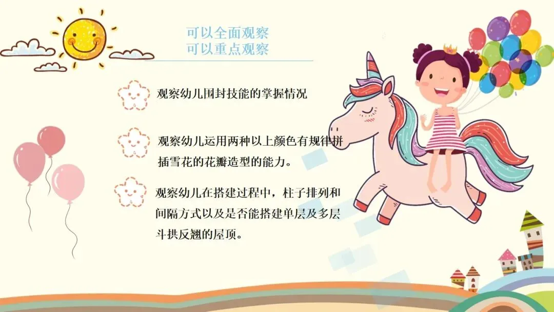 了解了概念,接下来就是本次培训的重点——建构游戏的观察要点。我们在观察时,既可以进行全面观察,也可以根据实际需求做重点观察,比如重点观察幼儿围封技能的掌握情况,观察幼儿运用两种以上颜色有规律拼插雪花片花瓣造型的能力,或是观察幼儿搭建中柱子的排列间隔、单层及多层斗拱反翘屋顶的搭建能力等。整体来说,观察要点主要围绕以下几个核心方面,同时还要兼顾建构游戏的环境以及教师介入指导的适宜性。