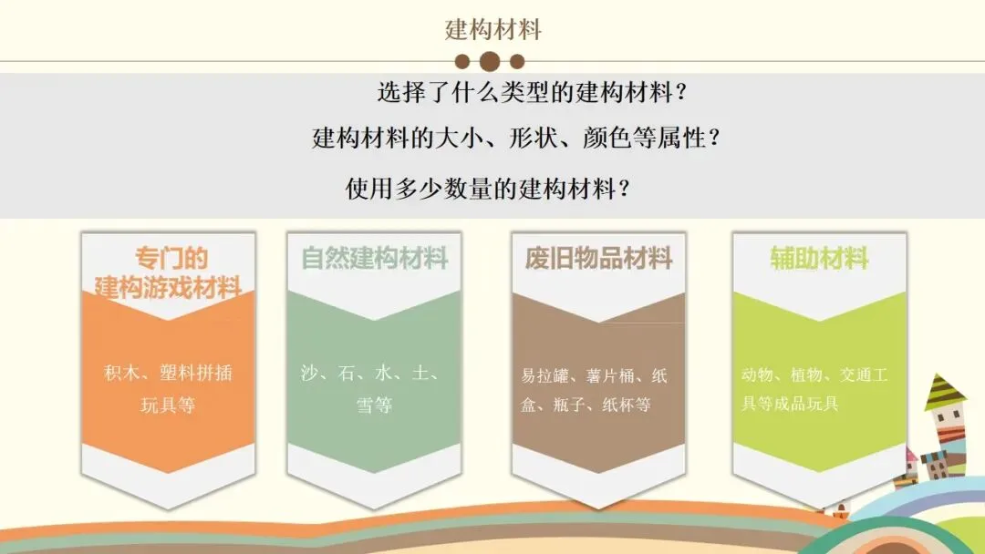 第一个观察要点是建构材料。我们要观察幼儿选择了什么类型的建构材料,是积木、塑料拼插玩具,沙、石、水、土、雪等自然材料,易拉罐、纸杯等废旧材料,还是动物、交通工具等成品玩具;还要关注建构材料的大小、形状、颜色等属性,以及幼儿使用材料的数量多少。