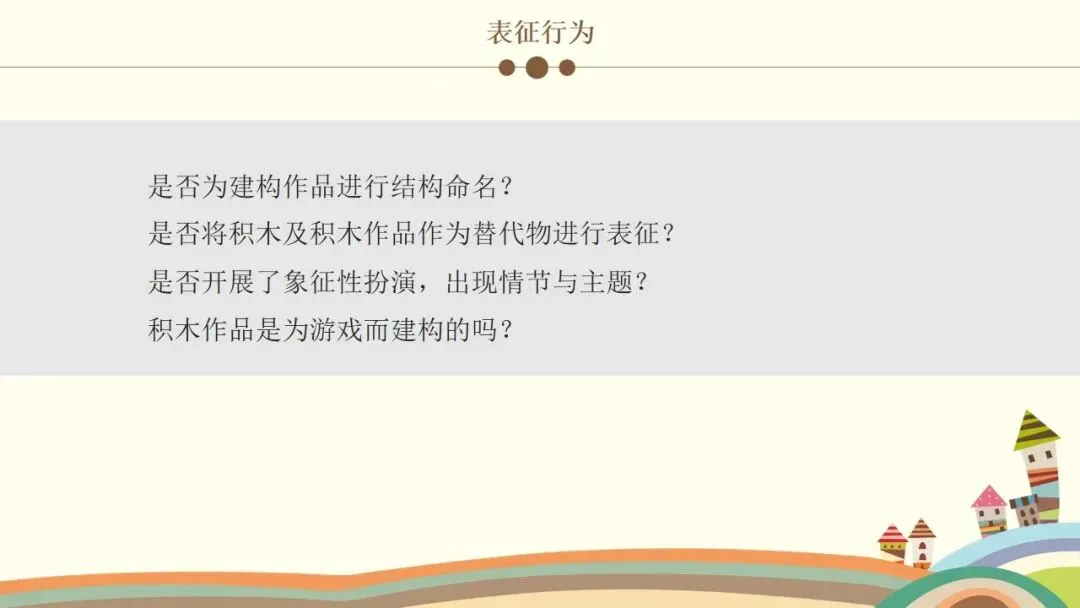 第三个观察要点是表征行为。主要看幼儿是否为建构作品进行结构命名;是否将积木及积木作品作为替代物进行表征;是否开展了象征性扮演,出现相关的情节与主题;以及积木作品是否是为游戏而建构的,这能反映出幼儿的想象力和表征能力发展。