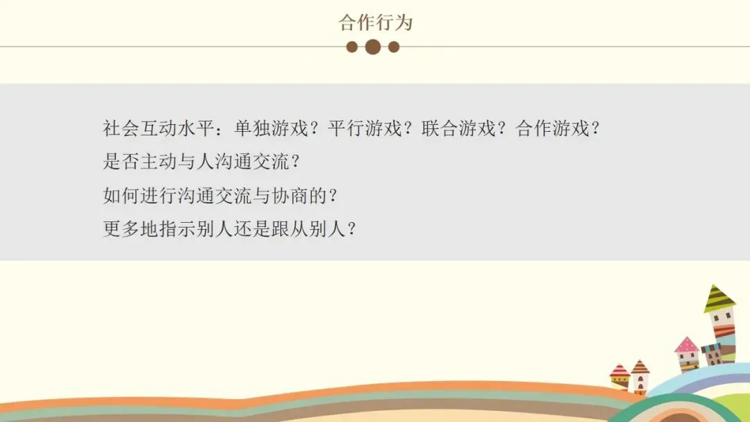 第四个是合作行为,这能体现幼儿的社会交往发展水平。首先看幼儿的社会互动水平,属于单独游戏、平行游戏、联合游戏还是合作游戏;幼儿是否主动与人沟通交流,如何进行沟通交流与协商;在互动中,幼儿更多地是指示别人,还是跟从别人,这些细节都能展现幼儿的。。。。。