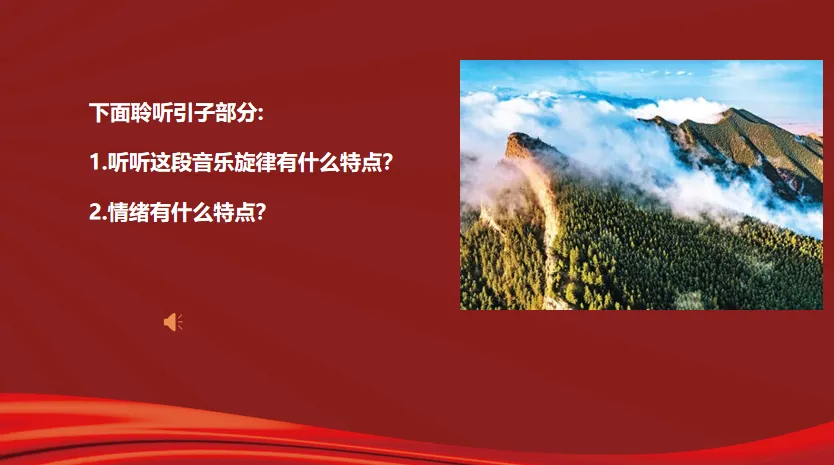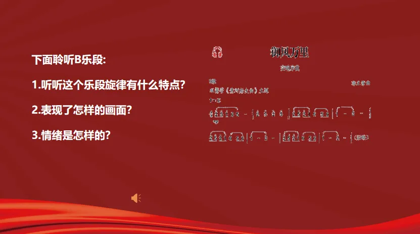 教师:首先聆听第一乐段,听听这个乐段的旋律有什么特点?速度是怎样的?情绪是怎样的?