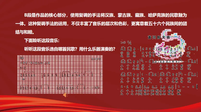 教师:第二乐段的情绪更加激动,音域变高,不同节奏型,如:切分、弱起、附点、同音高连音线等节奏的应用,使情绪不断递进,表达出作者对祖国的热爱。