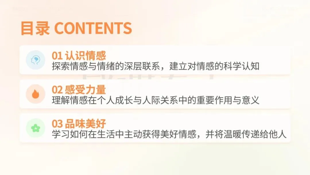 3.情感、态度与价值观目标:感受美好情感的价值,培养积极乐观的生活态度;树立正确的情感观,学会关爱他人、服务社会;涵养家国情怀、责任感、正义感等高级情感,让生命因情感而更精彩。