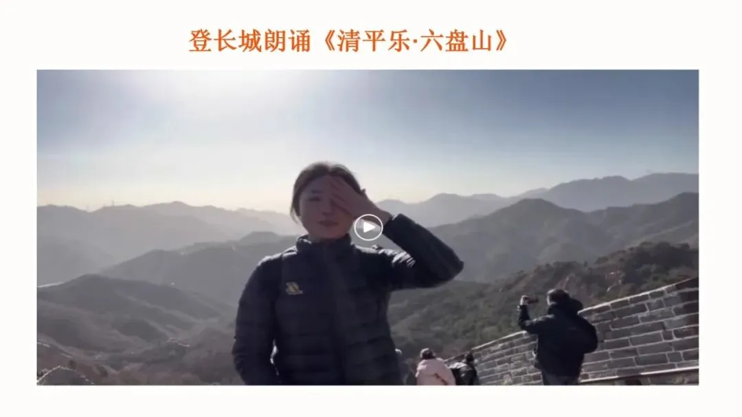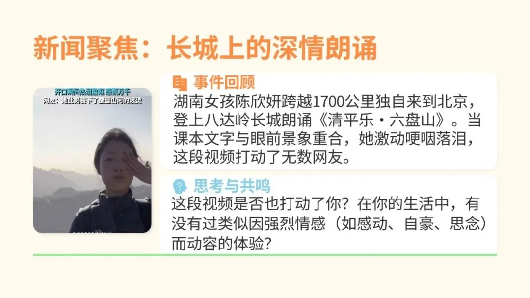 1.播放湖南女孩陈欣妍长城朗诵《清平乐·六盘山》哽咽落泪的短视频,提问引导: