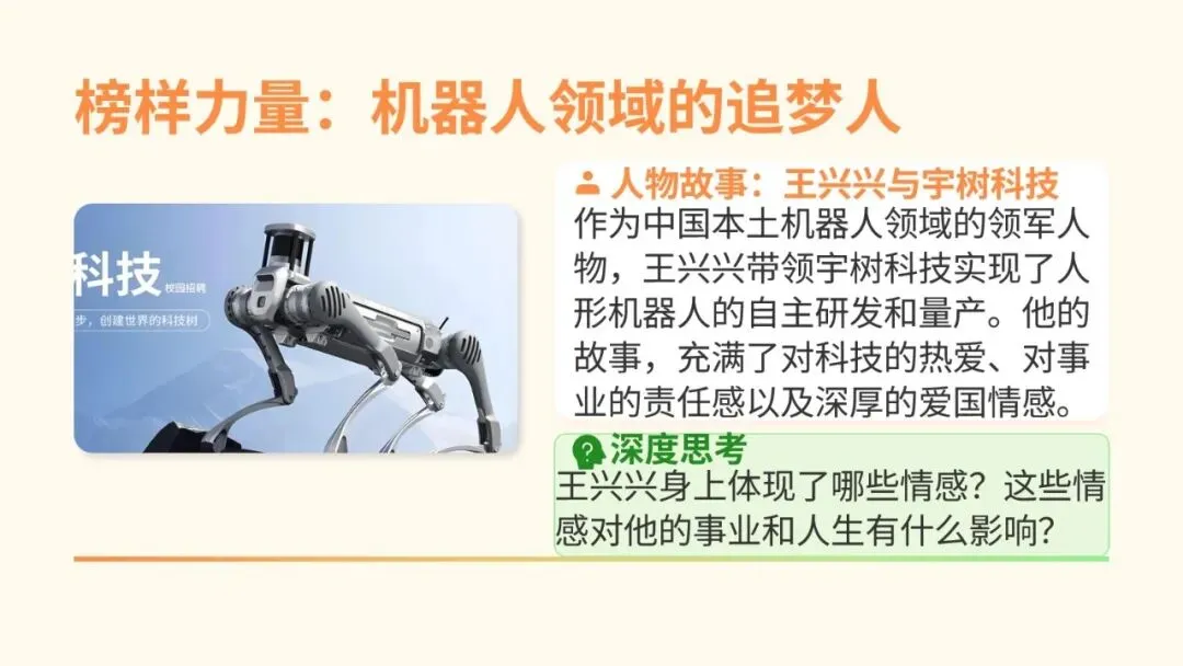 1.榜样引领,分析案例:呈现王兴兴与宇树科技的案例,提问探究:
