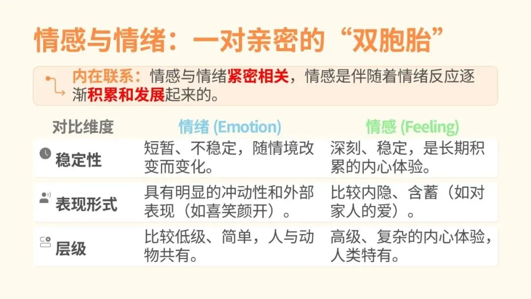 1.小组合作探究:结合课件呈现的“情感与情绪:一对亲密的双胞胎”内容,以小组为单位完成对比任务,梳理情绪与情感在稳定性、表现形式、层级上的区别,同时明确二者的联系(情感由情绪反应逐渐积累和发展而来)。
