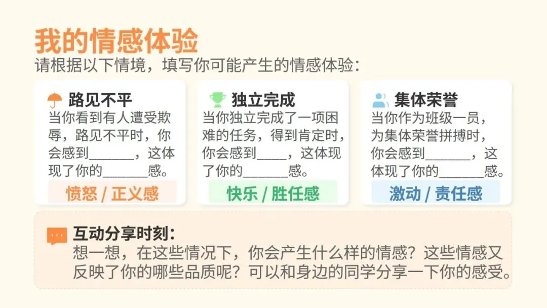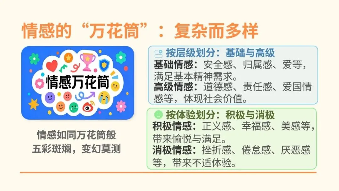 3.情感万花筒:教师讲解情感的分类——按层级分为基础情感(安全感、归属感、爱)和高级情感(道德感、爱国情感、责任感);按体验分为积极情感(幸福感、美感)和消极情感(挫折感、倦怠感),强调情感的复杂性和多样性。