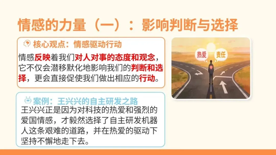 影响判断与选择,驱动行动:情感反映态度和观念,促使我们做出相应行动(如王兴兴因爱国和热爱选择自主研发);