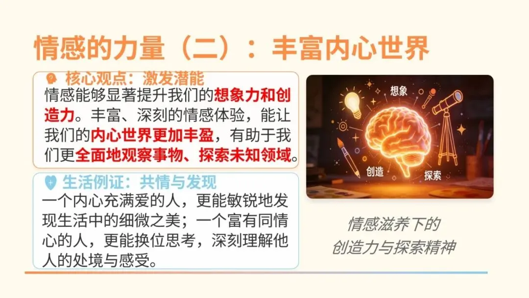 丰富内心世界,激发潜能:丰富的情感提升想象力和创造力,让我们更全面地观察事物;