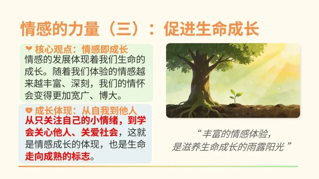 促进生命成长,拓宽情怀:情感的发展体现生命成长,让我们从关注自我走向关爱他人和社会。