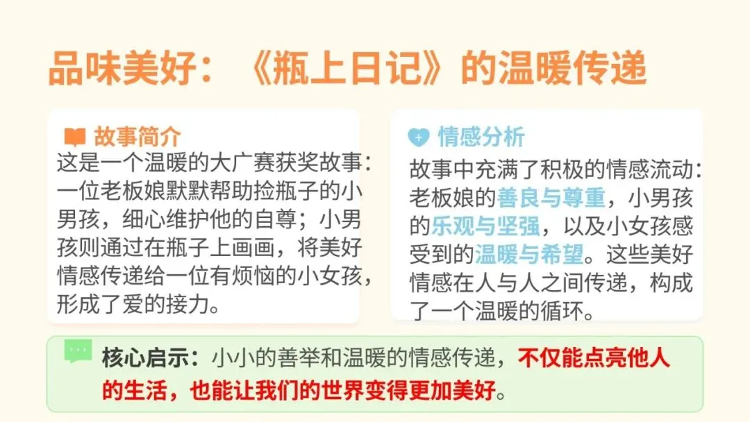 1.品味美好,感受情感传递:播放《瓶上日记》的故事片段,分析讨论: