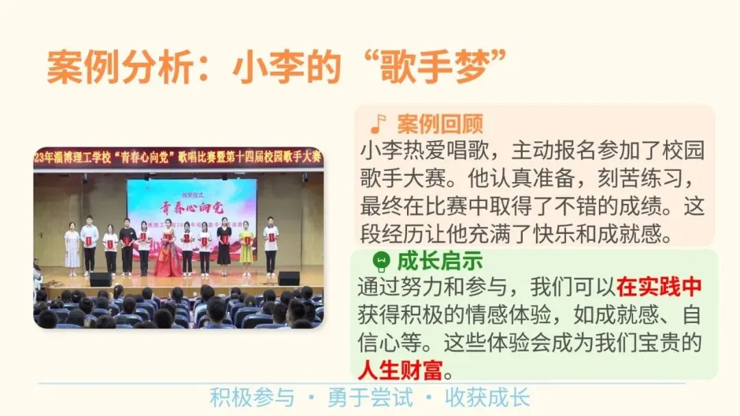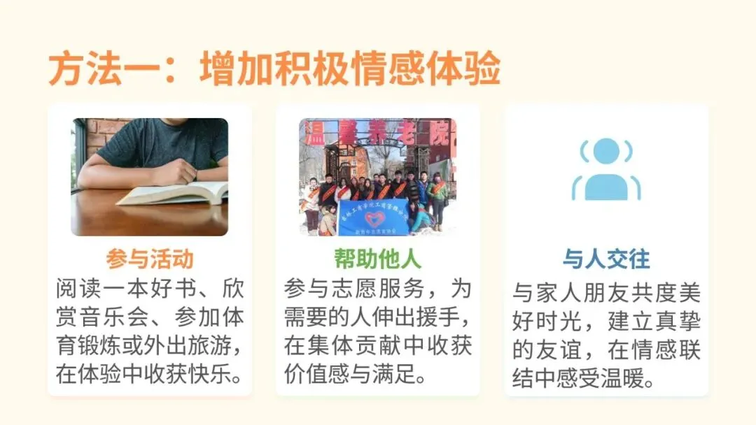 方法一:增加积极情感体验:结合“小李的歌手梦”案例,讲解通过参与活动(读书、旅游)、帮助他人(志愿服务)、与人交往(陪伴家人朋友)获得快乐、成就感、价值感;