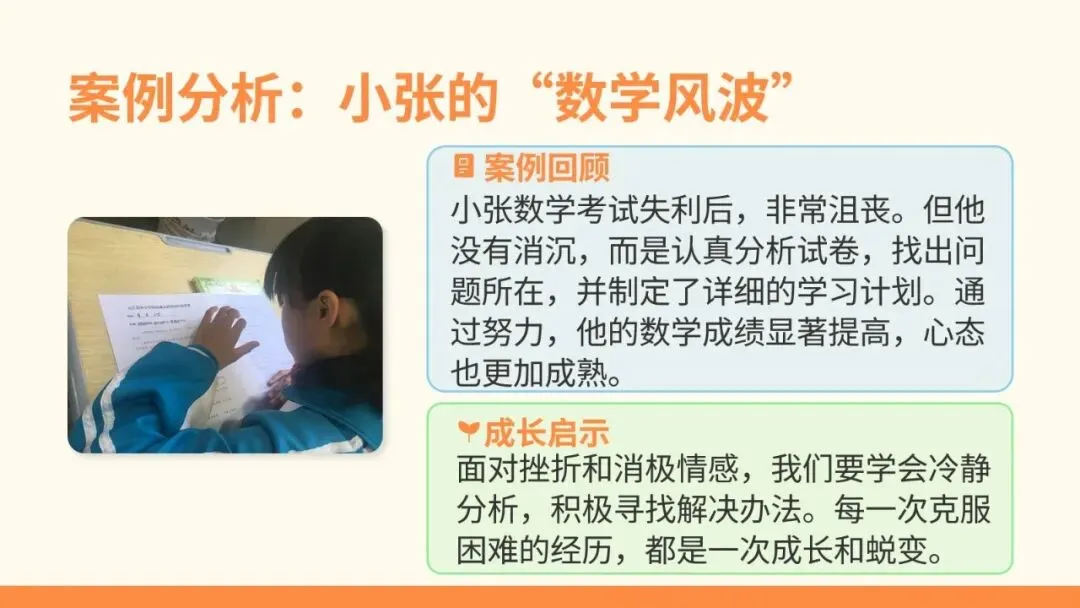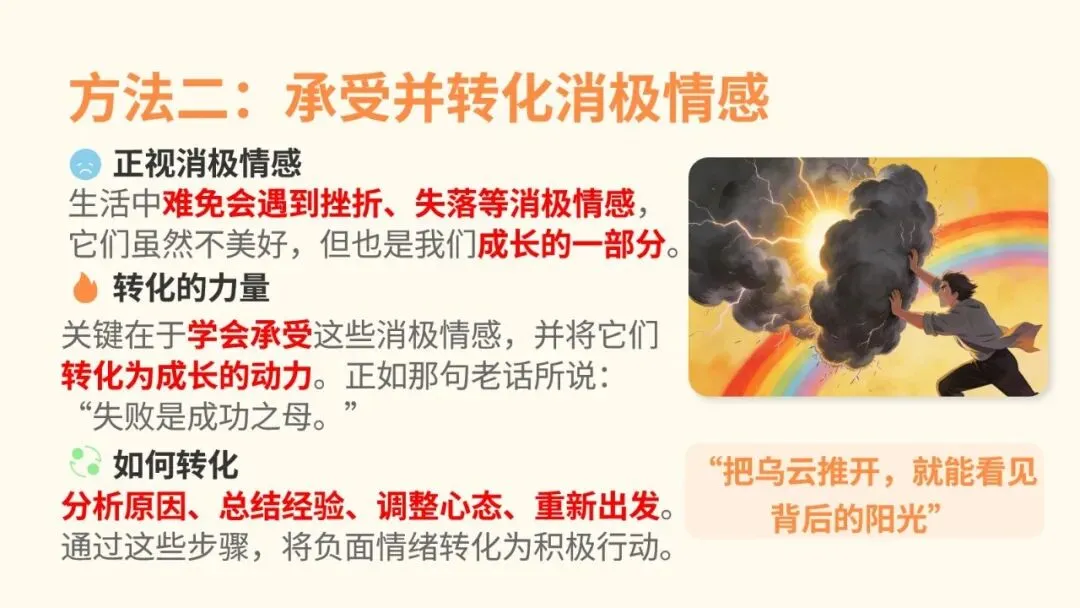 方法二:承受并转化消极情感:结合“小张的数学风波”案例,强调消极情感是成长的一部分,通过“分析原因—总结经验—调整心态—重新出发”将挫折感转化为成长动力;