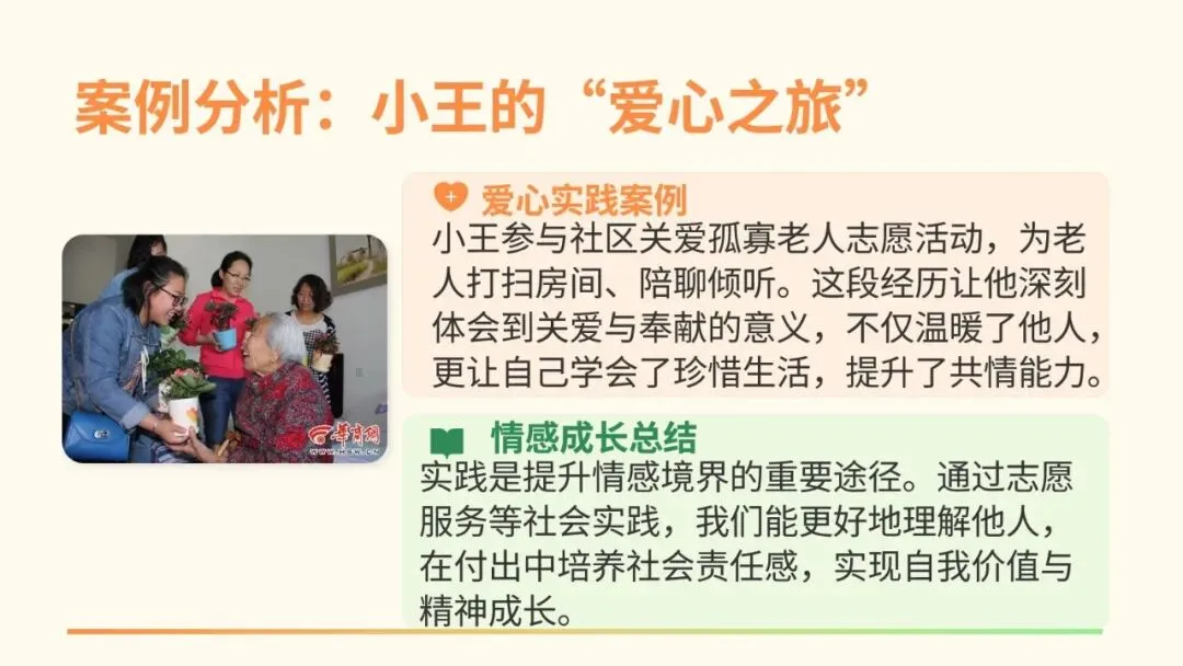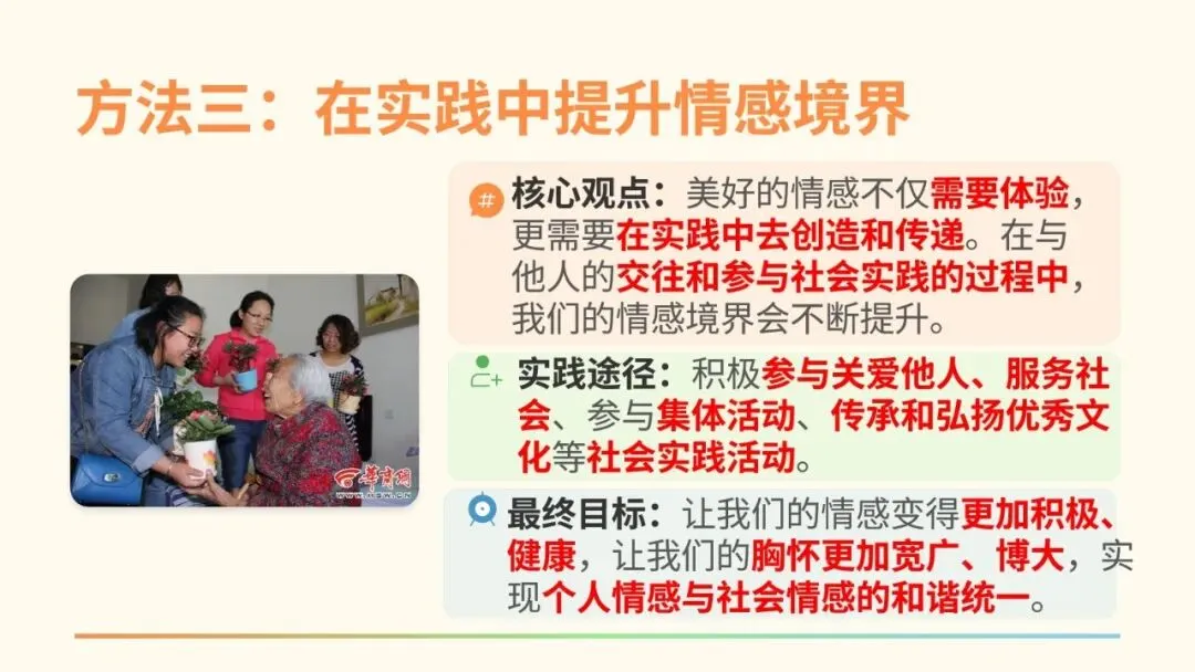 方法三:在实践中提升情感境界:结合“小王的爱心之旅”案例,说明参与关爱他人、服务社会的实践活动,能培养社会责任感,实现个人情感与社会情感的统一。