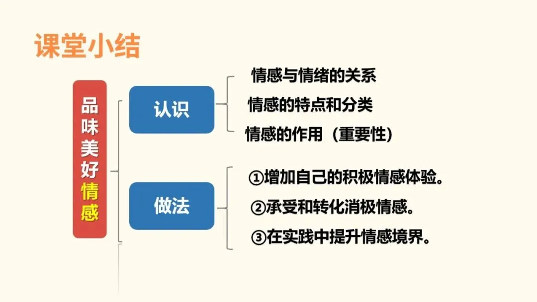 1.师生共同梳理知识框架:以“认识—作用—做法”为线索,回顾本节课核心知识点:情感情绪的关系、情感的分类与作用、获得美好情感的三大方法。