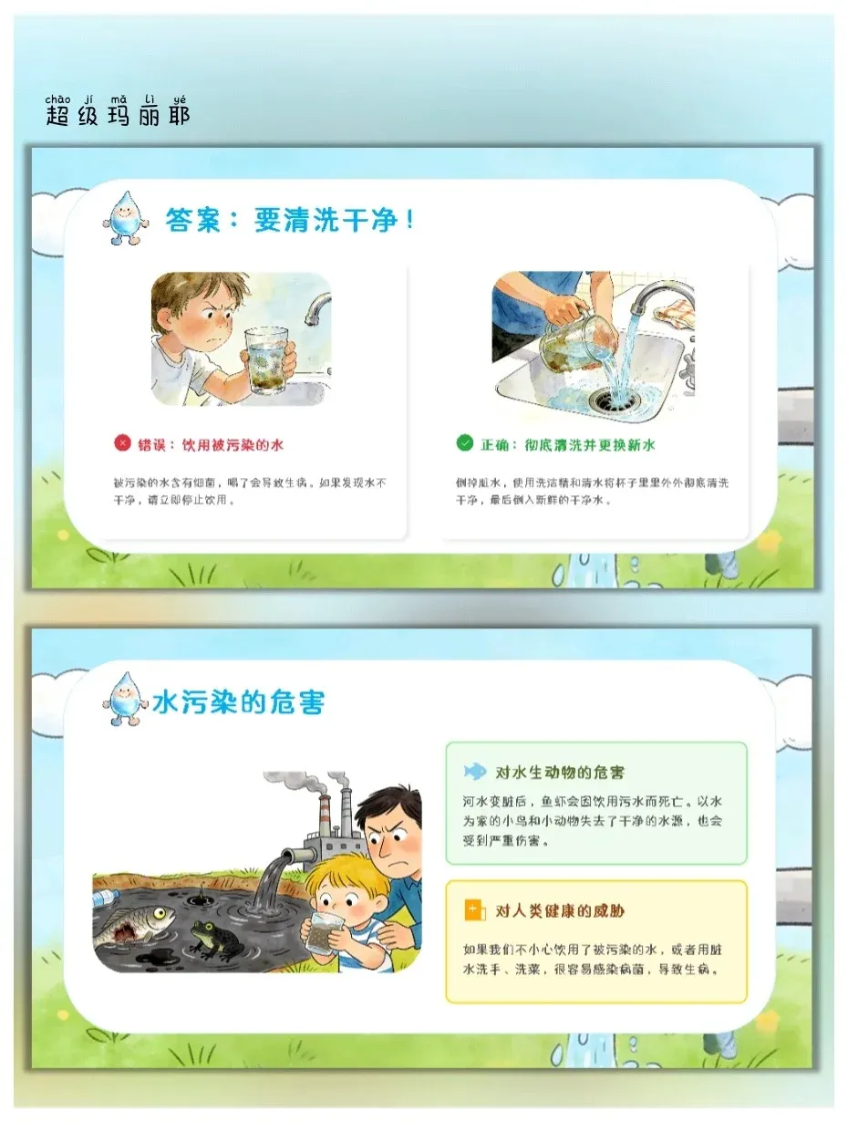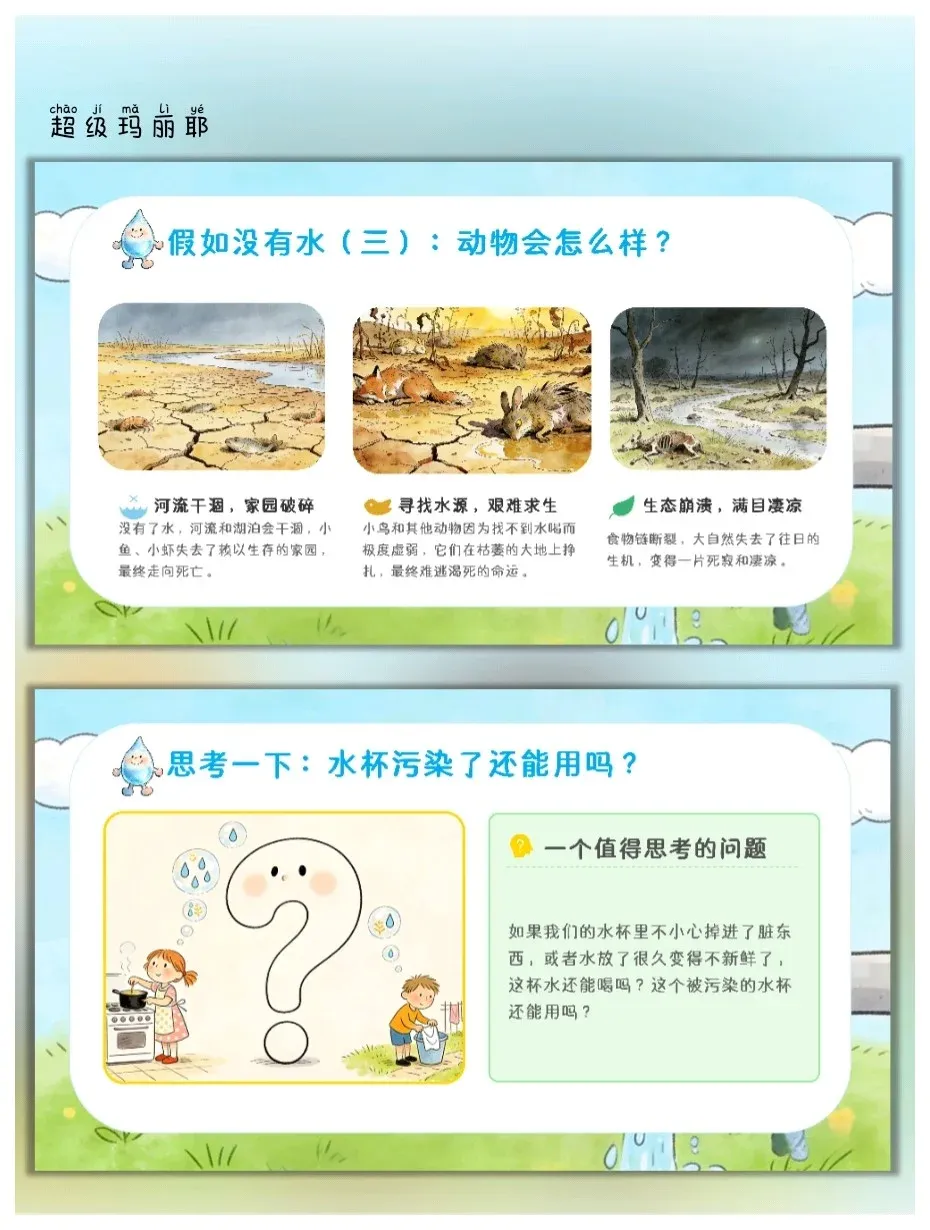 💡 03 假如没有水 不敢想象😭 人没水喝、没法清洁;植物枯萎、动物死亡;河流干涸、生态崩溃… 水污染还会让人生病!