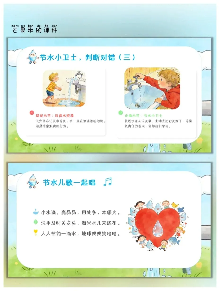 🎵 节水儿歌记心中 小水滴,亮晶晶,用处多,本领大 洗手及时关龙头,淘米水儿来浇花 人人节约一滴水,地球妈妈笑哈哈