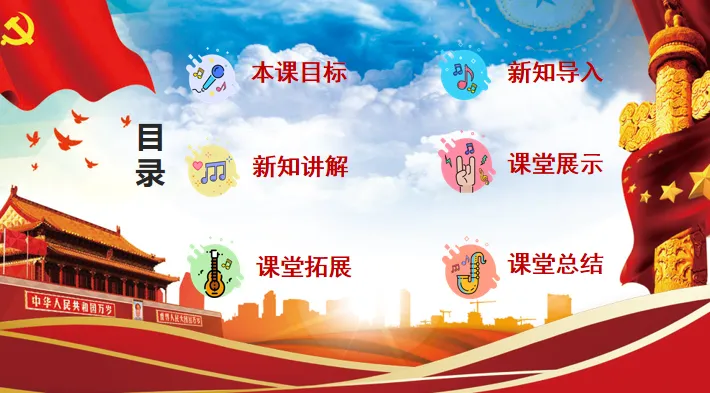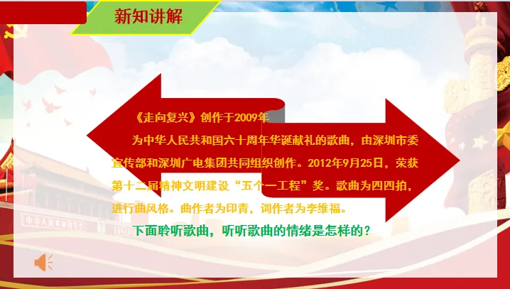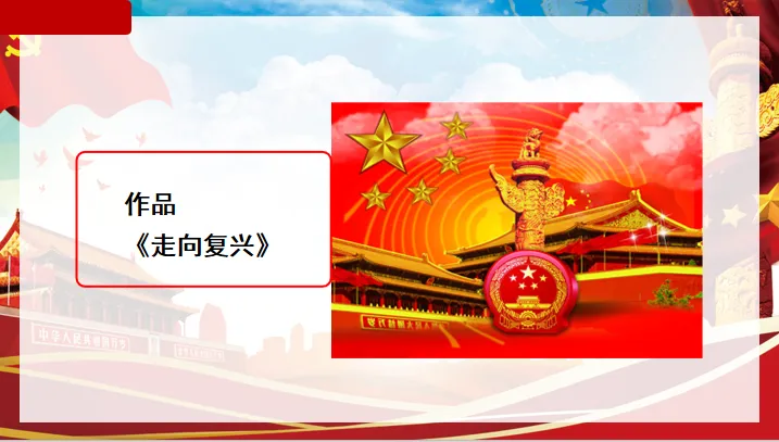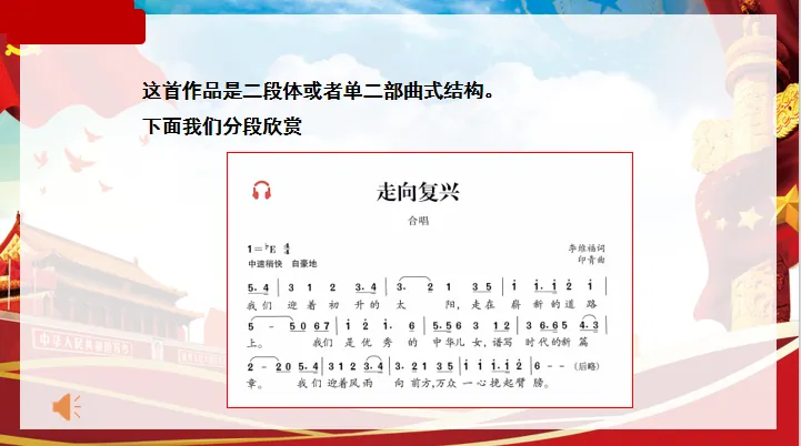 教师:首先我们了解一下这首作品的背景,《走向复兴》创作于2009年,是为中华人民共和国六十周年华诞献礼的歌曲,由深圳市委宜传部和深圳广电集团共同组织创作。2012年9月25日,荣获第十二届精神文明建设“五个一工程”奖。歌曲为四四拍,进行曲风格。曲作者为印青,词作者为李维福。
