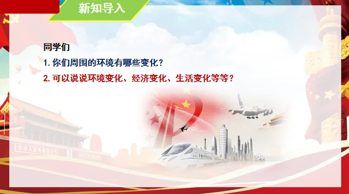 教师:同学们,你们周围的环境有哪些变化?可以说说环境变化、经济变化、生活变化等等。