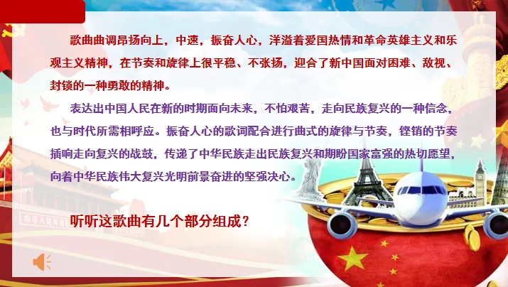 教师:歌曲曲调昂扬向上,中速,振奋人心,洋溢着爱国热情和革命英雄主义和乐观主义精神,在节奏和旋律上很平稳、不张扬,迎合了新中国面对困难、敌视、封锁的一种勇敢的精神。表达出中国人民在新的时期面向未来,不怕艰苦,走向民族复兴的一种信念,也与时代所需相呼应。振奋人心的歌词配合进行曲式的旋律与节奏,铿销的节奏插响走向复兴的战鼓,传递了中华民族走出民族复兴和期盼国家富强的热切愿望,向着中华民族伟大复兴光明前景奋进的坚强决心。