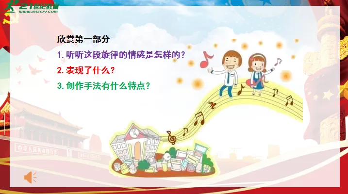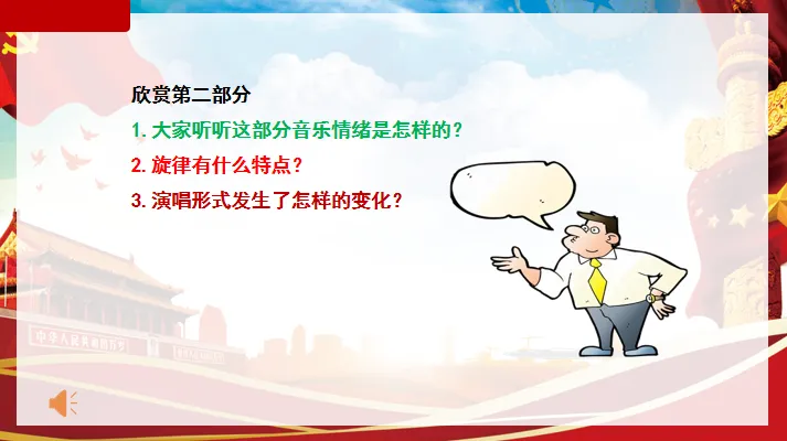 教师:第一部分出现了附点、弱起节奏使旋律富有跳跃性、铿锵有力,表现了人民坚定的信念和自信,在创作手法方面采用了完全重复和不完全重复的方法。