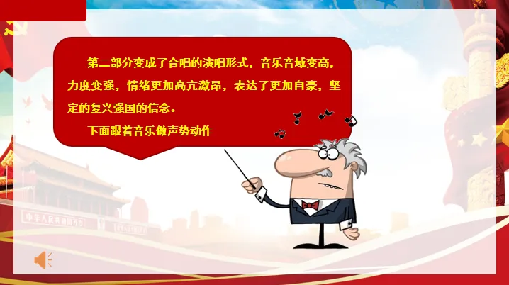 教师:第二部分变成了合唱的演唱形式,音乐音域变高,力度变强,情绪更加高亢激昂,表达了更加自豪,坚定的复兴强国的信念。下面跟着音乐做声势动作