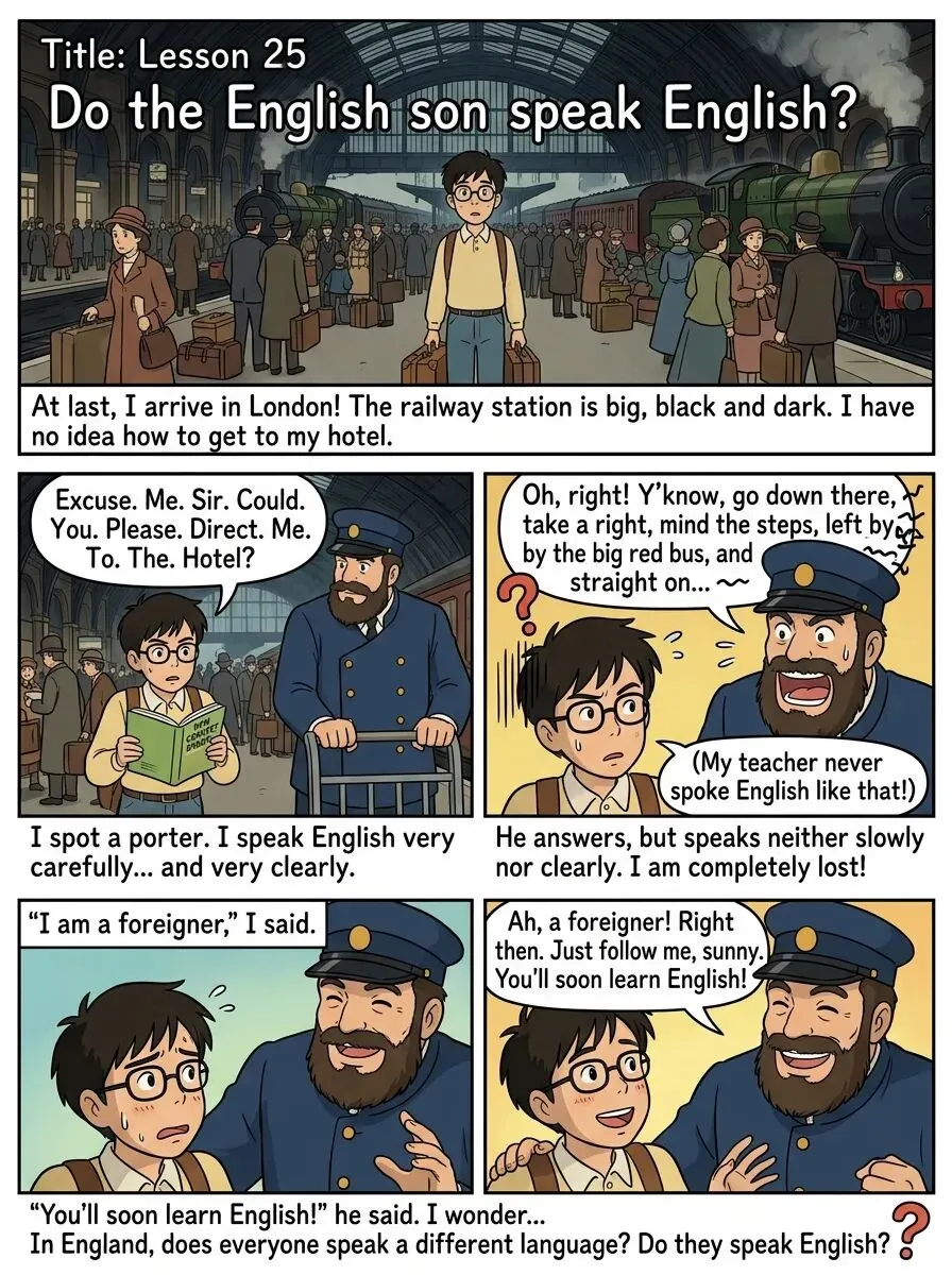 I arrived in London at last. The railway station was big, black and dark. I did not know the way to my hotel, so I asked a porter. I not only spoke English very carefully, but very clearly as well. The porter, however, could not understand me. I repeated my question several times and at last he understood. He answered me, but he spoke neither slowly nor clearly. 'I am a foreigner,' I said. Then he spoke slowly, but I could not understand him. My teacher never spoke English like that! The porter and I looked at each other and smiled. Then he said something and I understood it. 'You'll soon learn English!' he said. I wonder. In England, each person speaks a different language. The English understand each other, but I don't understand them! Do they speak English?