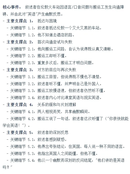 - 发展 (Attempt & Failure): 句子4-9:尝试沟通(认真清晰地问路),却遭遇两次失败(搬运工听不懂我;他回答后我听不懂他)。