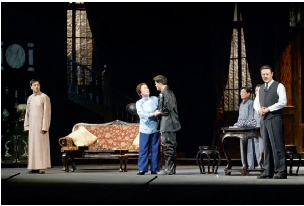 既看出是个阔绰豪华的资本家家庭,又有浓重的封建色彩。一个立柜和上面触目的大照片,既透露出故事发生的根由,又为剧情发展提供了条件。2.人物的服装:
