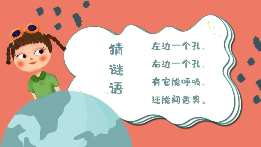 教师出示谜语,引导幼儿集体猜谜:“左边一个孔,右边一个孔,有它能呼吸,还能闻香臭。”