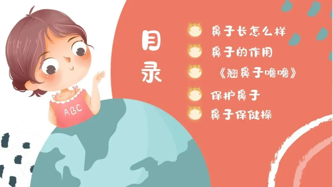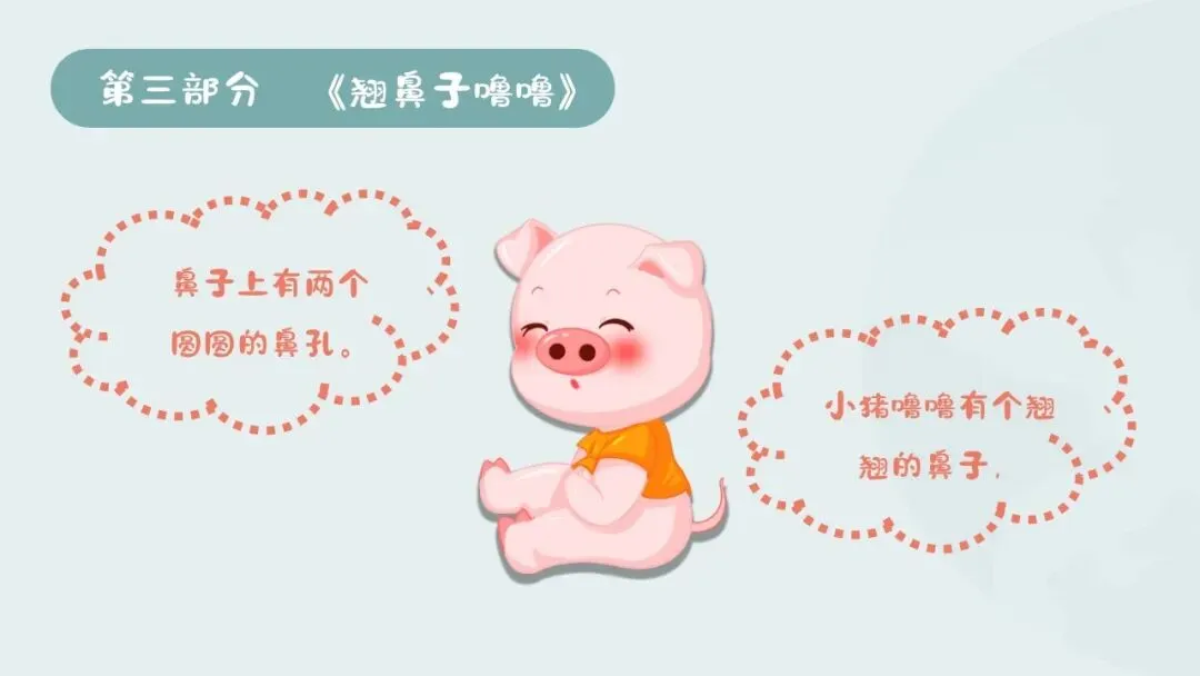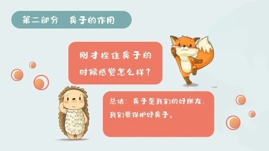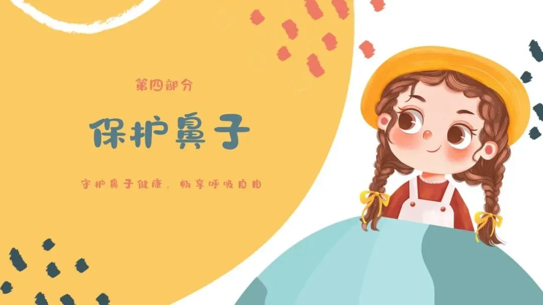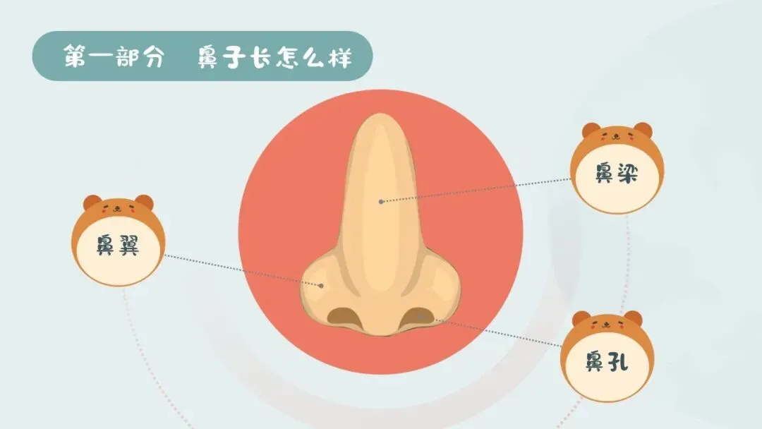 1.教师播放PPT,展示鼻子的结构图片,依次介绍鼻翼、鼻孔、鼻梁的名称和位置,引导幼儿用小手轻轻摸一摸自己的鼻翼、鼻梁,看一看同伴的鼻孔,直观感知鼻子的外形结构。