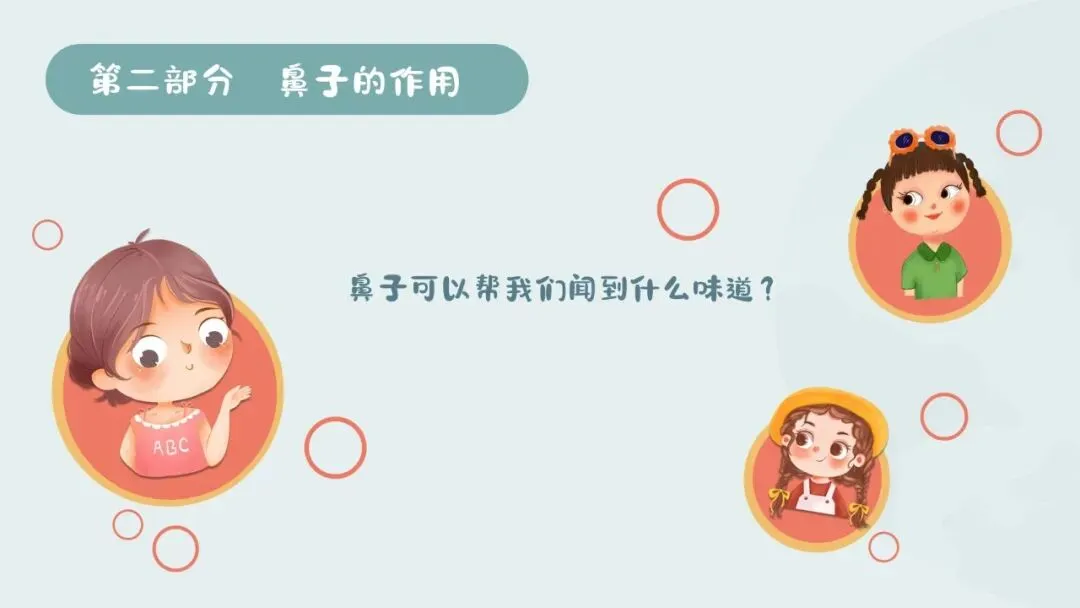 1.探索嗅觉作用:教师提问“小朋友们,你们是怎么知道饭菜香、花儿香,还有垃圾桶臭臭的呀?”,引导幼儿说出是用鼻子闻到的。教师进一步引导幼儿说一说自己用鼻子闻到过的各种味道,让幼儿感知鼻子的嗅觉功能。