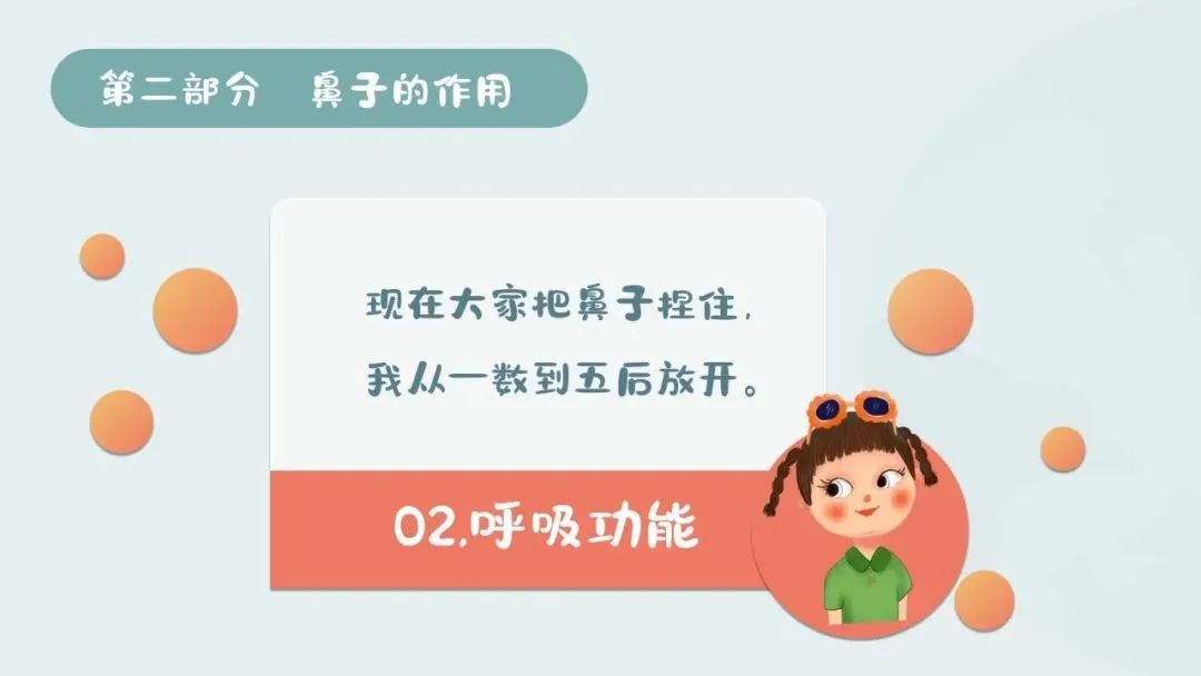 2.体验呼吸功能:教师组织互动小游戏,让幼儿捏住自己的鼻子,教师从1数到5,让幼儿在过程中感受捏住鼻子后的感受。数完后请幼儿分享体验,教师小结:鼻子是我们呼吸的重要器官,没有鼻子帮忙呼吸,我们会觉得憋得难受,鼻子的呼吸功能能让我们自由地呼吸新鲜空气。