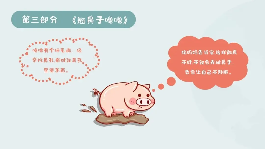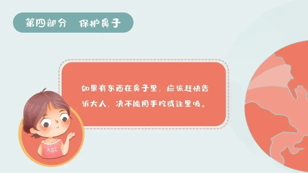 3.情感目标:了解挖鼻孔、往鼻孔塞异物的危害,愿意主动养成爱护鼻子、讲究卫生的好习惯,树立保护自身器官的意识。