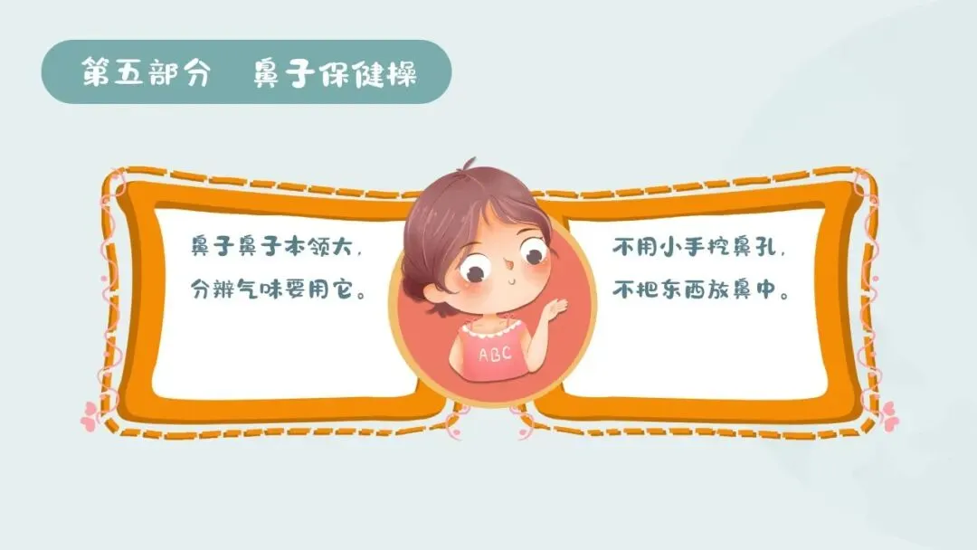 2.技能目标:掌握保护鼻子的正确方法,知道鼻子进异物或出血时的正确处理方式,能跟着儿歌学做鼻子保健操。