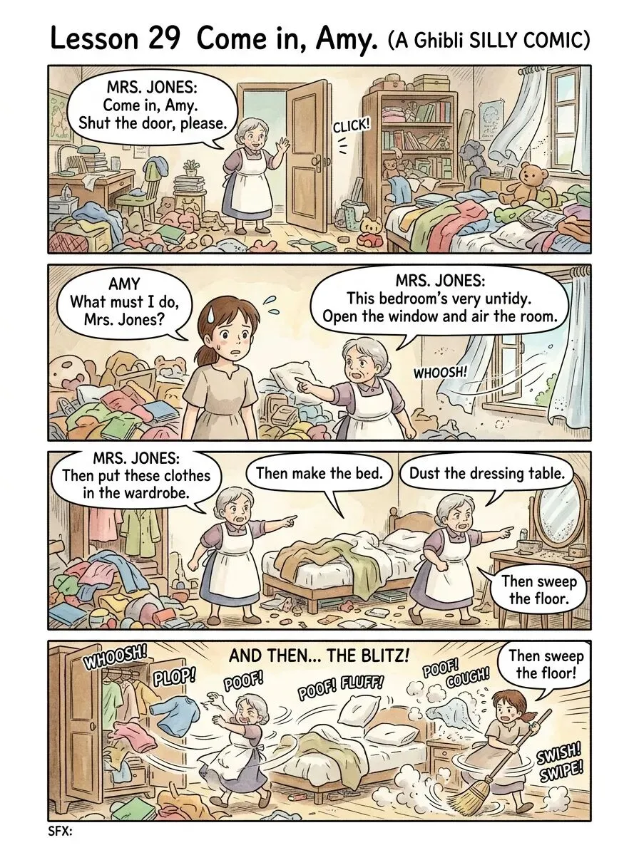 情景说明:本课场景发生在琼斯夫人(Mrs. Jones)的家中,很可能是Amy(可能是她的孩子、房客或帮忙的人)的房间。琼斯夫人进入一个非常凌乱(untidy)的卧室,随即给出一系列清晰、连贯的指令,指导Amy如何整理房间。对话体现了英国家庭中长辈对晚辈或雇主对帮手在布置任务时的典型方式:直接、有序、使用祈使句和"must"来表达必要性和权威性。