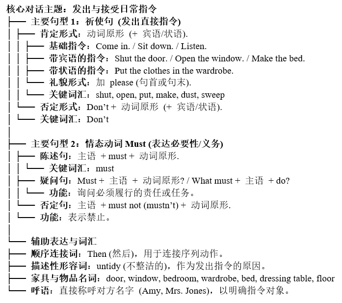 1. 日常用语与礼貌表达分析:- 指令发起:课文以观察陈述(This bedroom's very untidy.)作为指令的**理由**,比直接命令更易接受。接着用What must I do?引导出具体任务清单,这是一种**问答式**的任务布置模式。- 礼貌层级:Shut the door, please. 中的please软化了命令。What must I do? 本身也体现了服从和寻求指导的礼貌态度。一系列以Then连接的祈使句,结构清晰,避免了重复的"你必须......",显得干练而不冗杂。- 应答模式:Amy的应答What must I do?是典型的**确认和接受任务**的回应。在实际对话中,接受指令后还可以说"OK.", "All right.", "I will."等。