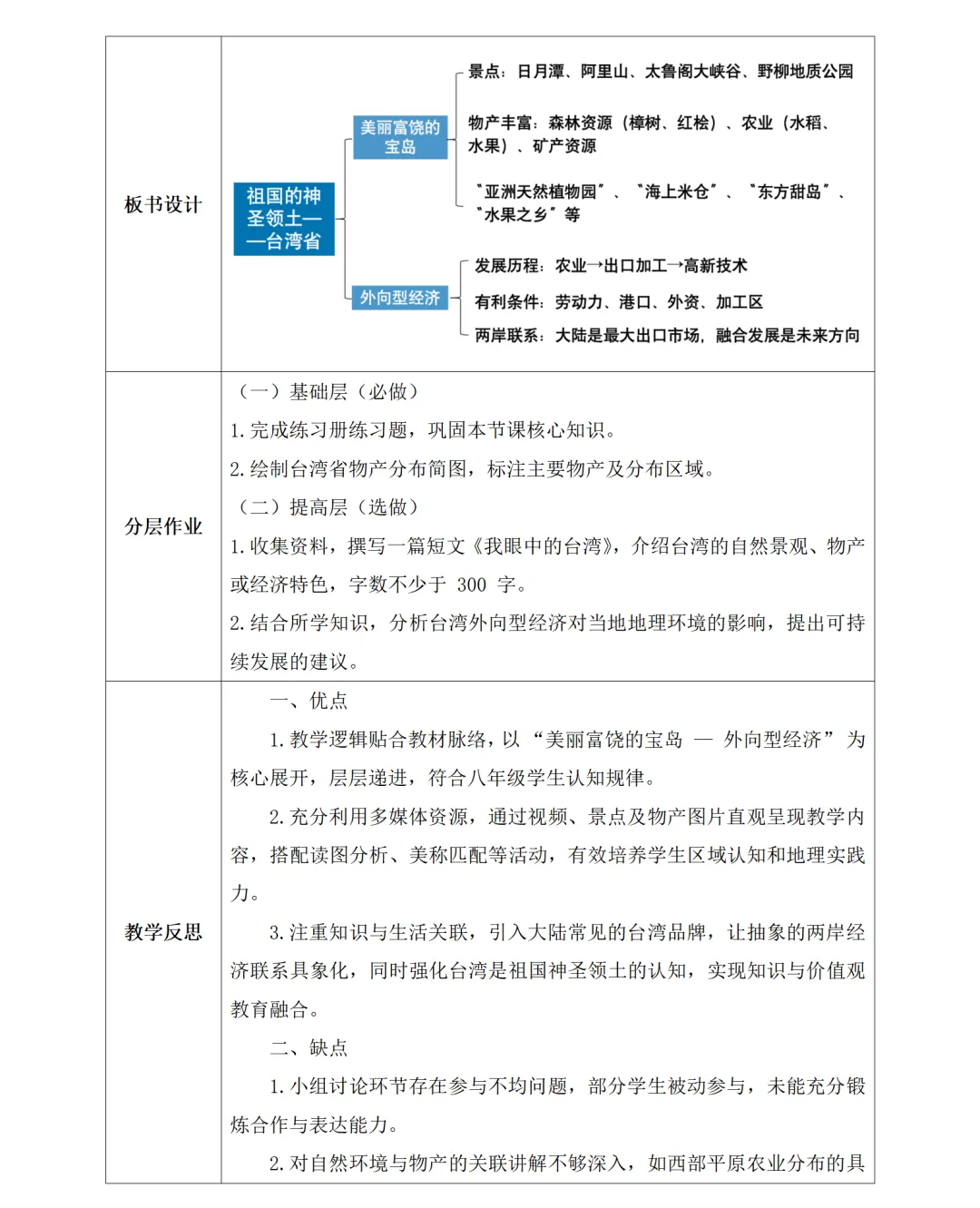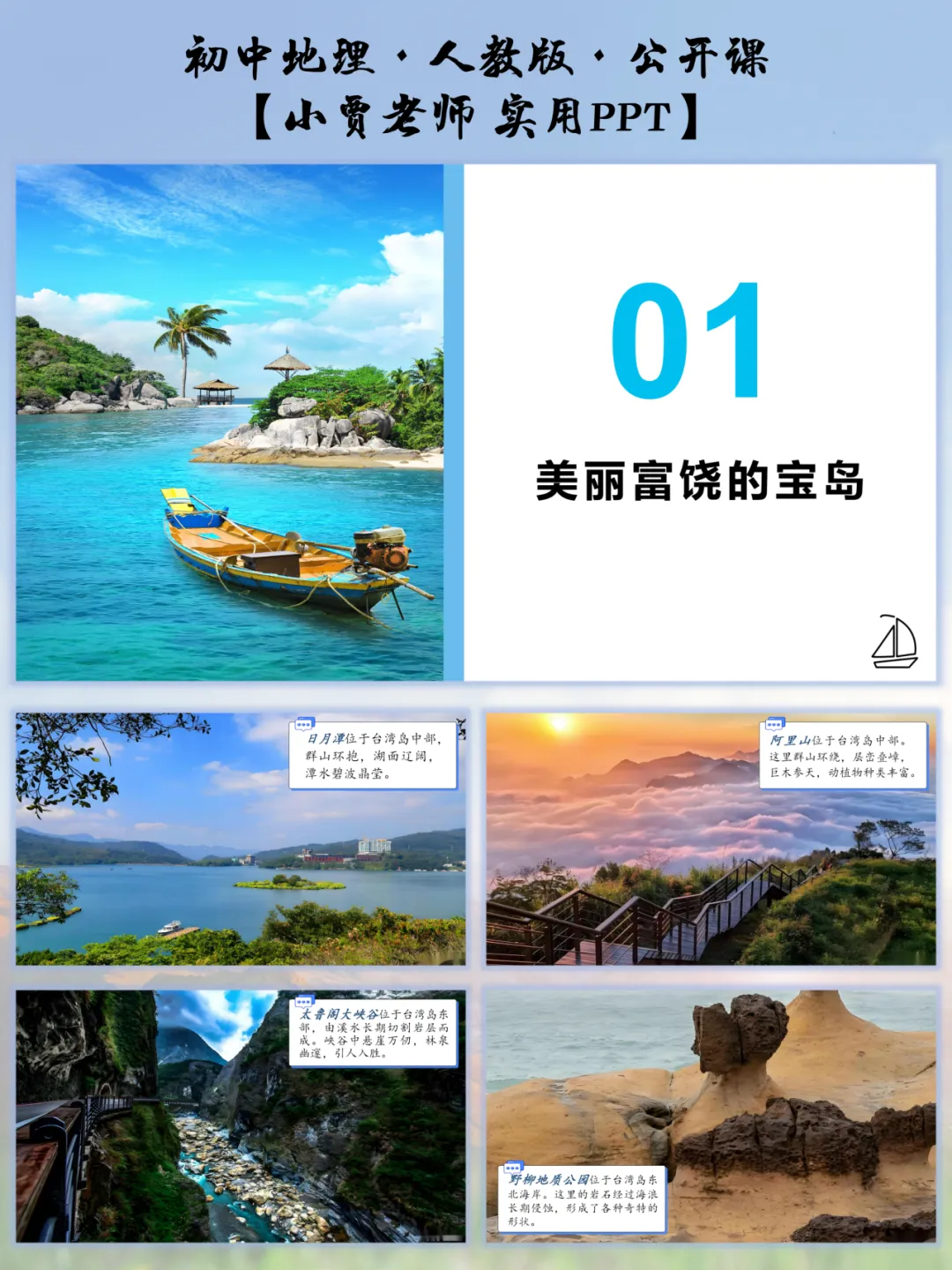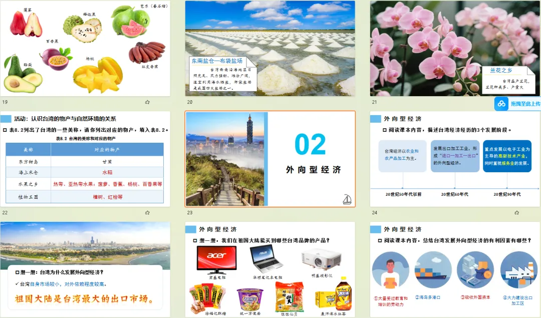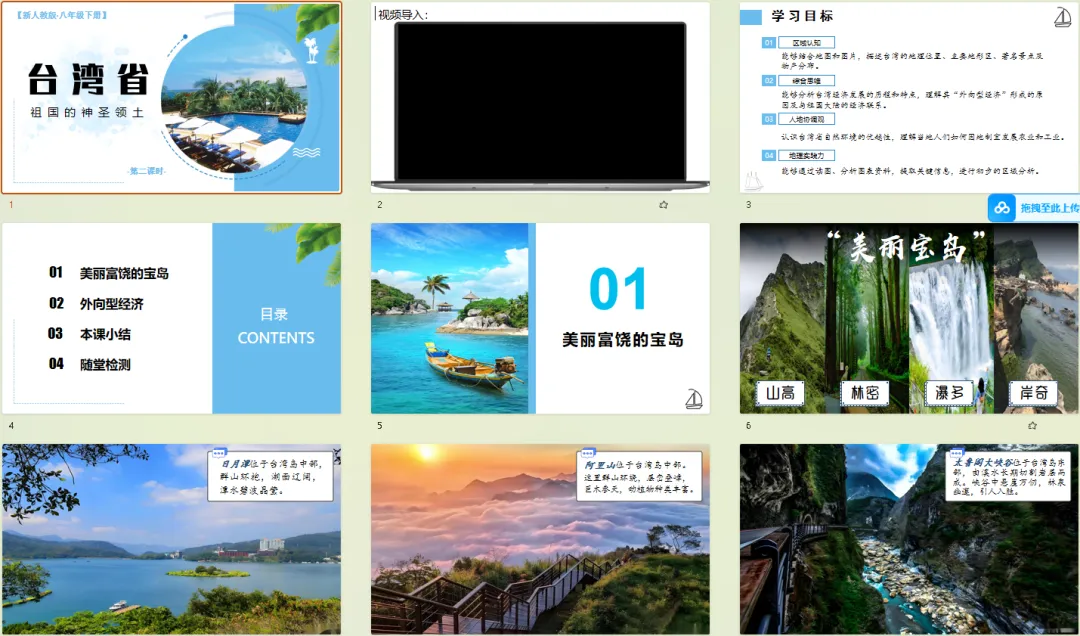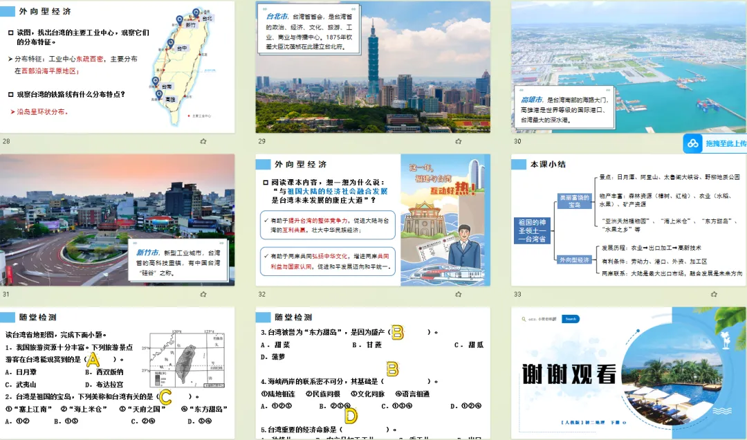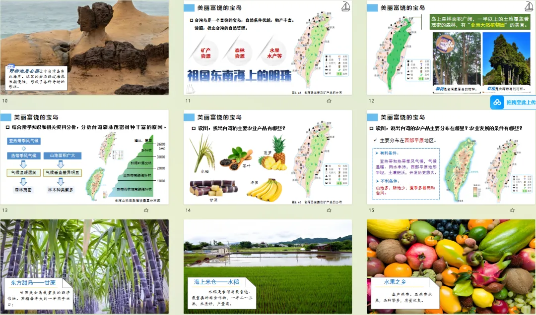 紧扣日月潭、阿里山等实景图,给每处风光贴 “地理标签”:日月潭的 “群山环绕、湖水辽阔” 对应台湾中部山地地形;阿里山的 “植被丰富” 关联热带亚热带季风气候的湿热条件;野柳地质公园的奇特岩柱对应沿海风化地貌。学生看美景的同时,自然把景观和地理特征绑定,不用死记硬背也能 get 宝岛的地形气候逻辑。