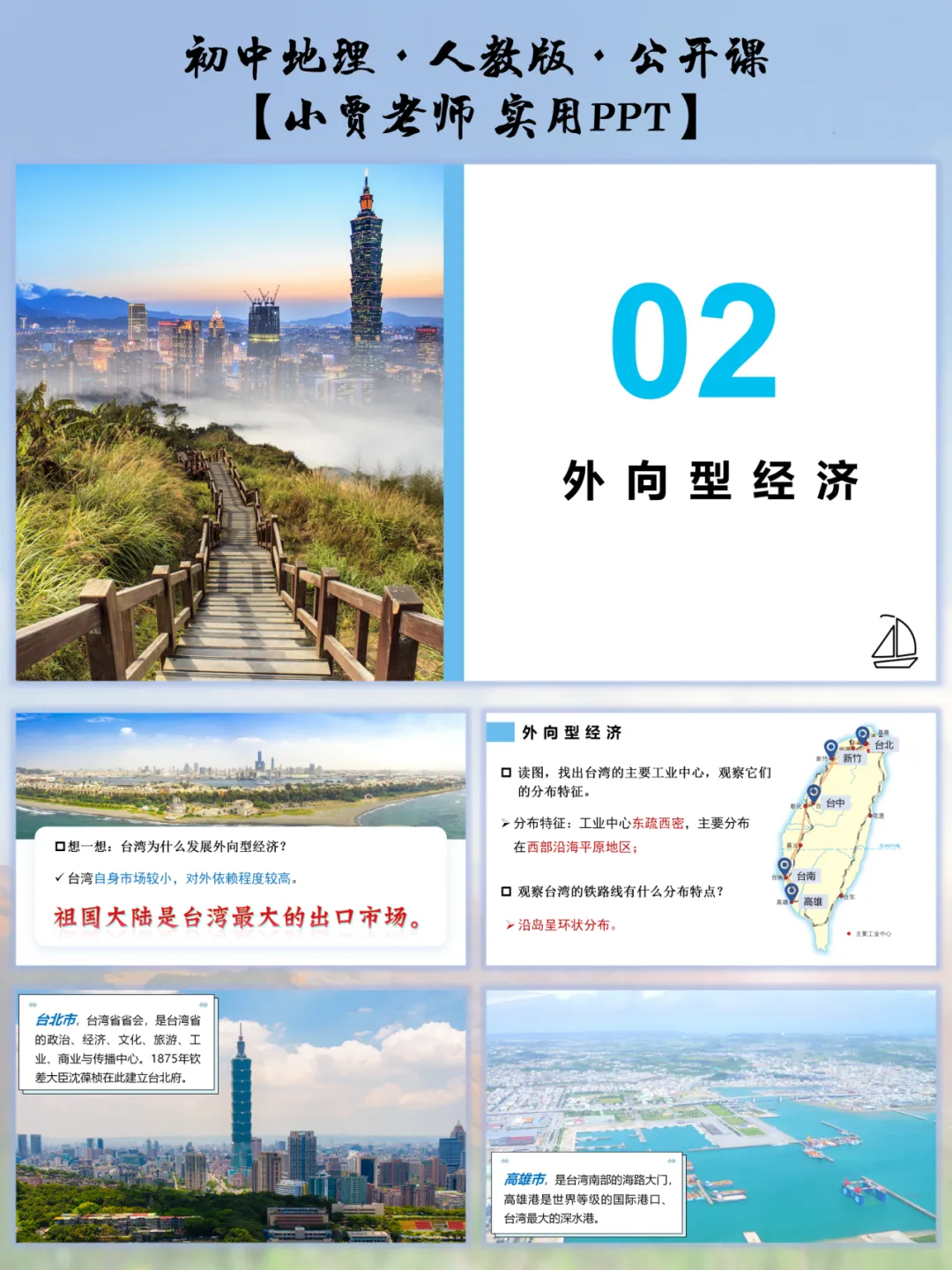 聚焦 “外向型经济” 板块,把工业中心、交通线的分布 “译” 成地理逻辑:工业中心集中在西部平原,对应 “地形平坦 + 交通便利” 的发展条件;铁路呈环岛状分布,契合台湾岛的狭长形态;再结合 “祖国大陆是最大出口市场” 的标注,让学生懂 “外向型经济” 不止是产业类型,更是 “依托大陆市场 + 利用港口优势” 的发展智慧,抽象经济概念变直观可感。