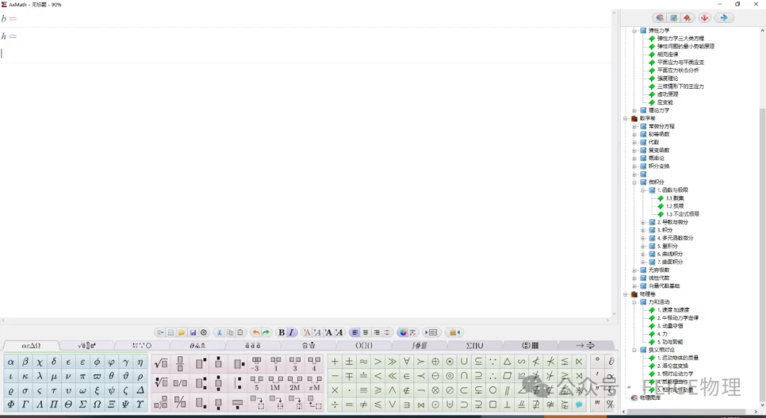 符号输入便捷Axmath 提供了多种符号输入方式。它有一个庞大的符号库,包含了物理中常用的希腊字母(如、、等)、数学运算符(如、、等)以及各种物理量符号(如表示速度、表示时间等)。老师们可以通过鼠标点击或者快捷键的方式快速输入这些符号,避免了在不同输入法之间频繁切换的麻烦。