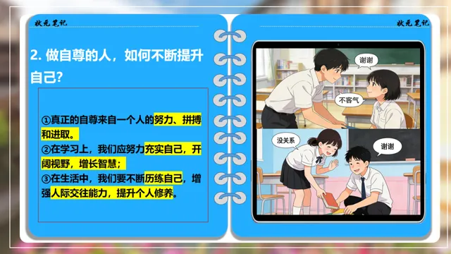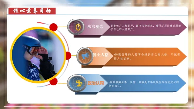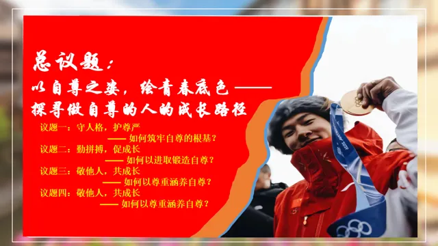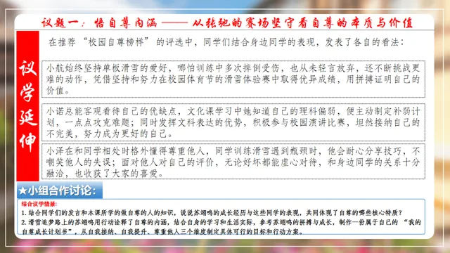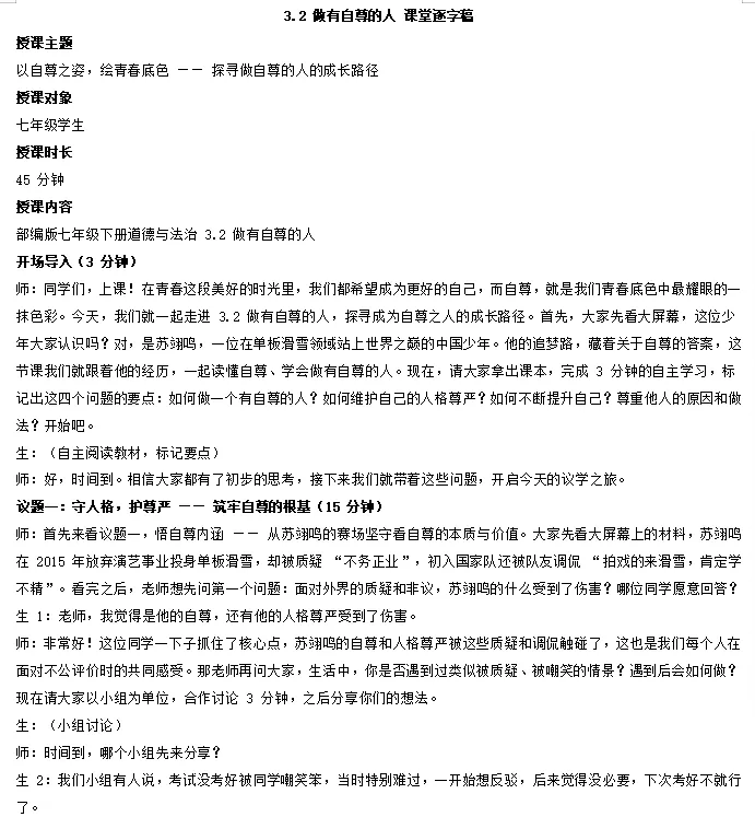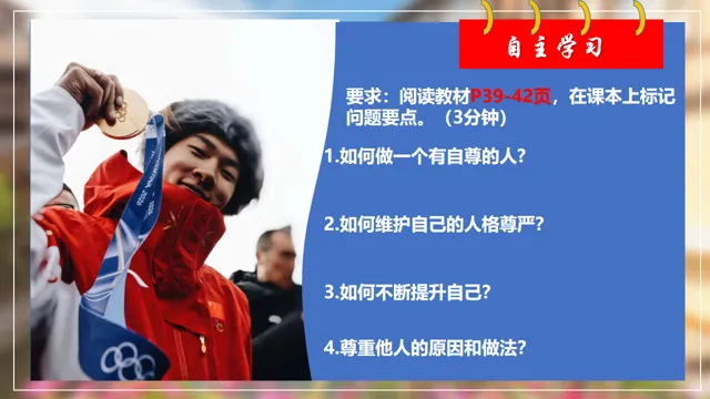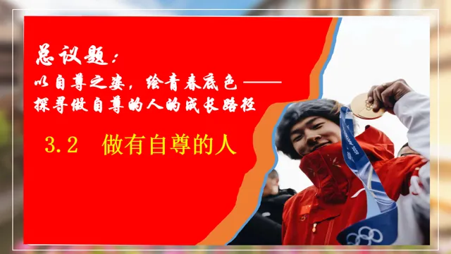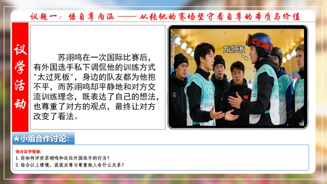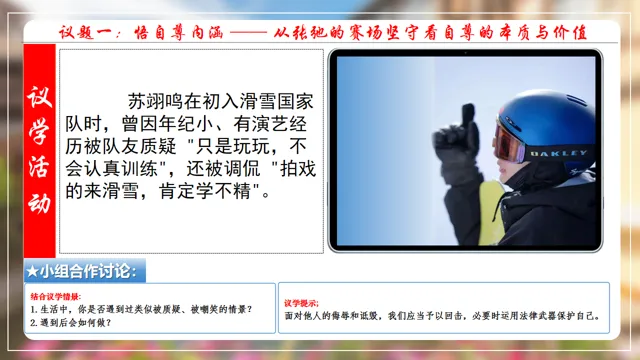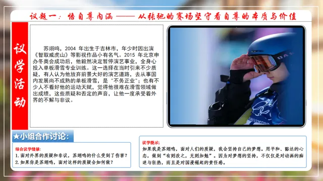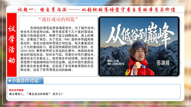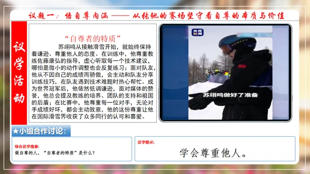 本节课以米兰滑雪冠军苏翊鸣为素材,设置四个议学环节引导学生如何理解做有自尊的人。